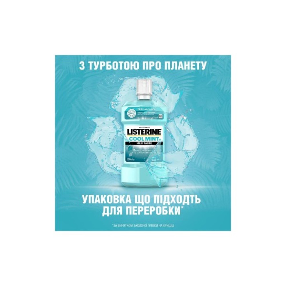 ОПОЛІСКУВАЧ ДЛЯ РОТОВОЇ ПОРОЖНИНИ LISTERINE® СВІЖА М’ЯТА М’ЯКИЙ СМАК. ПРИ ВИКОРИСТАННІ ДВІЧІ НА ДЕНЬ ЗАВДЯКИ ВМІСТУ ЕФІРНИХ ОЛІЙ І М’ЯКОМУ М’ЯТНОМУ СМАКУ ПОКРАЩУЄ ЩОДЕННИЙ ДОГЛЯД ЗА РОТОВОЮ ПОРОЖНИНОЮ: