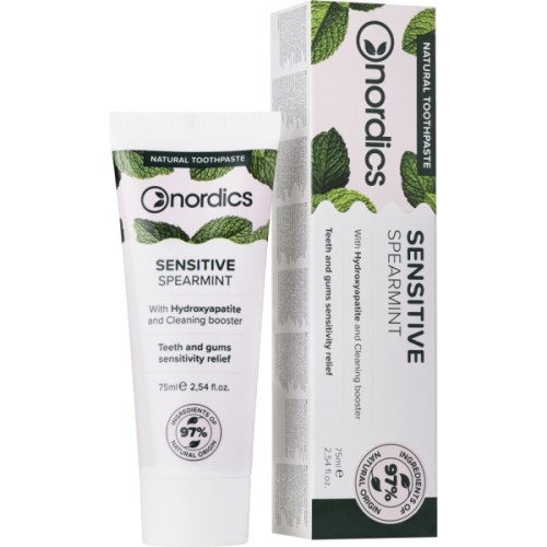 Зубна паста Nordics Sensitive Spearmint — це ідеальний вибір для ніжного догляду за чутливими яснами та зубами. Її унікальна формула поєднує природну свіжість м'яти з ефективністю для комплексного захисту. Завдяки органічним інгредієнтам — екстрактам алое, кропиви та шавлії — вона не тільки зміцнює емаль, але й забезпечує здоров'я ясен.
