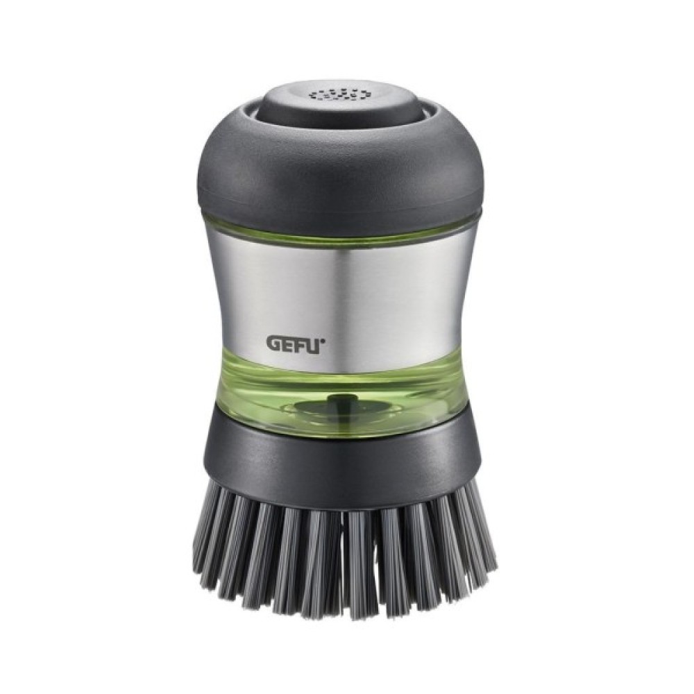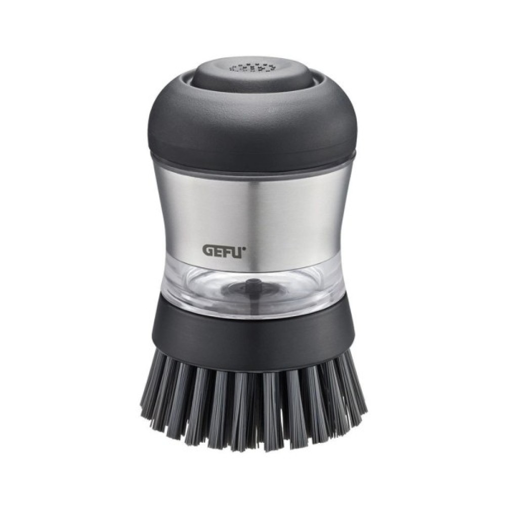 Щітка для миття посуду GEFU SWIFT з дозатором має міцну нейлонову щетину, яка ефективно очищує каструлі та посуд.