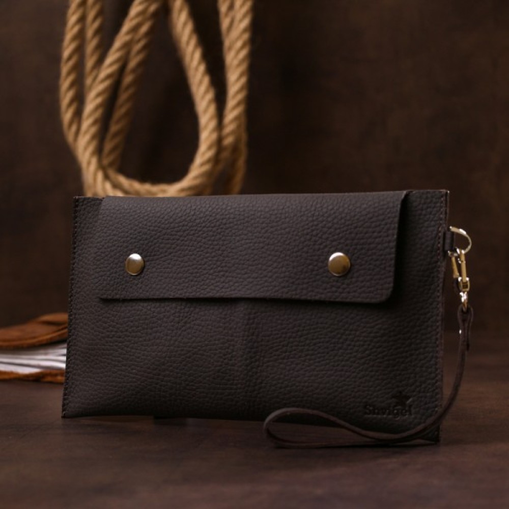 Красива та практична тревел-косметичка з натуральної високоякісної шкіри з високими показниками стійкості до зношування. Виріб виконаний у крупнозернистій фактурі, має темний коричневий колір та матову поверхню, що виглядає дуже стильно. Закривається аксесуар на клапан із двома кнопками, також є знімний шкіряний ремінець на зап'ястя.