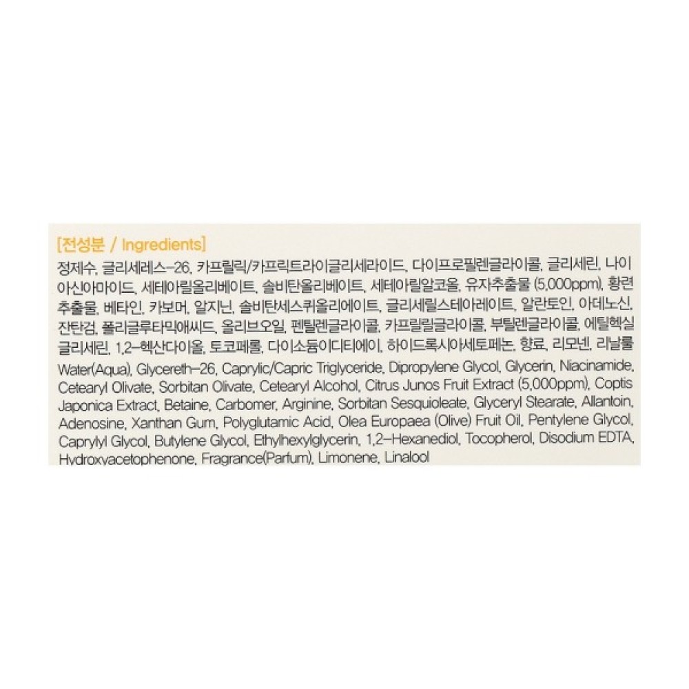 Склад water(aqua), glycereth-26, caprylic/capric triglyceride, dipropylene glycol, glycerin, niacinamide, cetearyl olivate, sorbitan olivate, cetearyl alcohol, citrus junos fruit extract (5,000ppm), coptis japonica extract, betaine, carbomer, arginine, sorbitan sesquioleate, glyceryl stearate, allantoin, adenosine, xanthan gum, polyglutamic acid, olea europaea (olive) fruit oil, pentylene glycol, caprylyl glycol, butylene glycol, ethylhexylglycerin, 1,2-hexanediol, tocopherol, disodium edta, hydroxyac