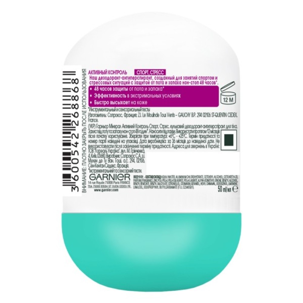 Антиперспірант, Garnier, Mineral, Активний, Контроль, Спорт, Стрес, 50, мл, 3600542268868