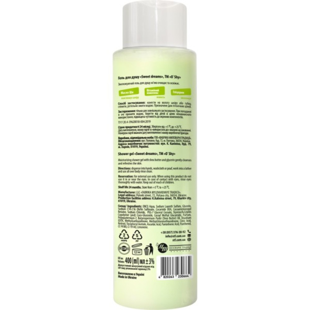 Завдяки своєму об'єму у 400 мл, цей продукт є економічним рішенням для тривалого використання. Вироблений в Україні, гель для душу O'Shy Sweet Dreams належить до класу мас-маркет, що гарантує високу якість за доступну ціну. Обираючи цей продукт, ви обираєте момент щастя щоразу, коли відкриваєте кришку флакона. Перетворіть свій щоденний ритуал у справжню насолоду з O'Shy Sweet Dreams!
