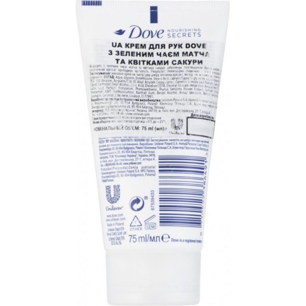 Крем для рук Dove із зеленим чаєм Матча та квіткою Сакури 75 мл (8710522386491)
