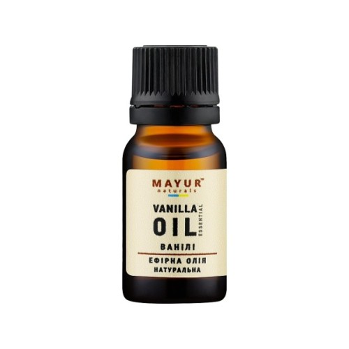 Натуральна ефірна олія ванілі від бренда Mayur має безліч корисних косметичних і ароматичних властивостей. Це природний антисептик, який справляє на організм людини розслаблювальну, протизапальну, болезаспокійливу, антидепресивну й седативну дію. Теплий солодкий аромат допомагає подолати стрес, зняти емоційну напругу. Він допомагає налаштуватися на позитивне мислення, забезпечує відчуття захищеності й душевного тепла, підвищує впевненість у власних силах і працездатність, а також доглядає шкіру.