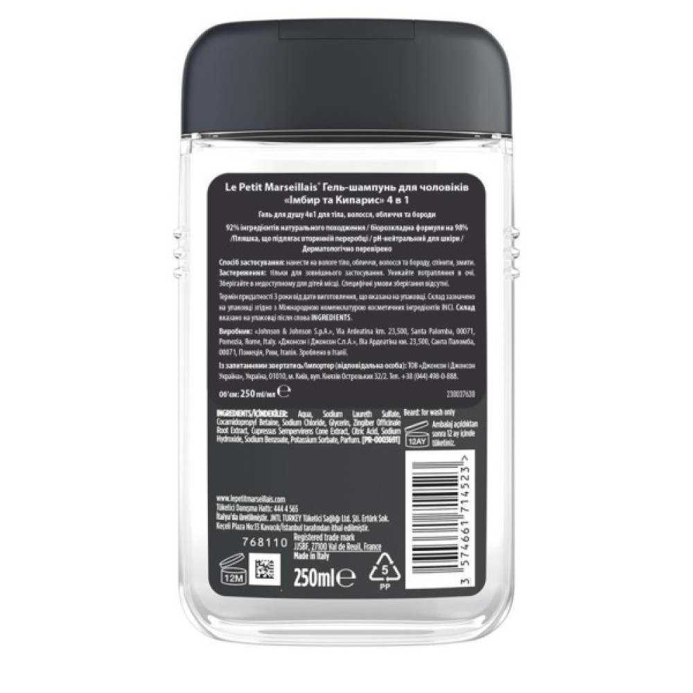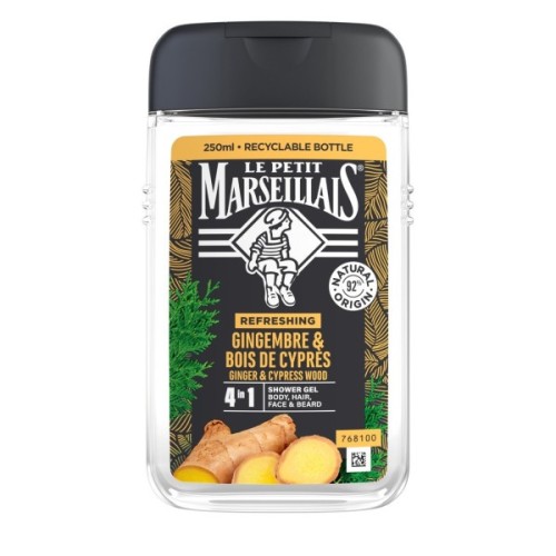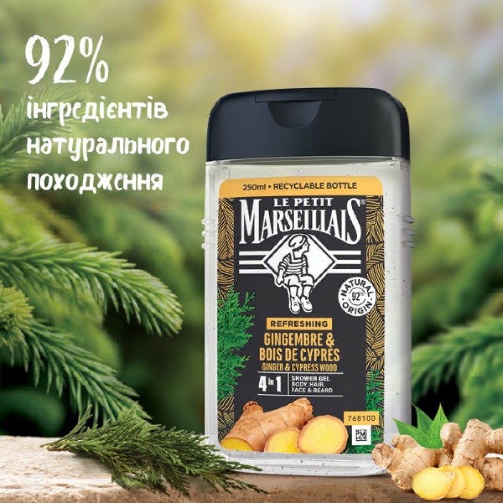 Гель для душу Le Petit Marseillais 4 в 1 «Імбир і Кипарисове дерево» об'ємом 250 мл, створено спеціально для чоловіків, що цінують якість та універсальність. Цей засіб передбачає очищення, освіження, та зволоження вашого тіла, волосся, обличчя та бороди.