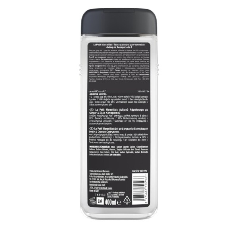 Le Petit Marseillais Гель для душу 4 в 1 «Імбир і Кипарис» створений спеціально для активних чоловіків, які цінують якість і зручність. Цей універсальний засіб підходить для очищення тела, волосся, обличчя та бороди, забезпечуючи ідеальний догляд за всіма зонами. Завдяки натуральним інгредієнтам, таким як екстракти імбиру та кипарисового дерева, гель робить шкіру зволоженою та м'якою, а волосся — блискучим і здоровим.