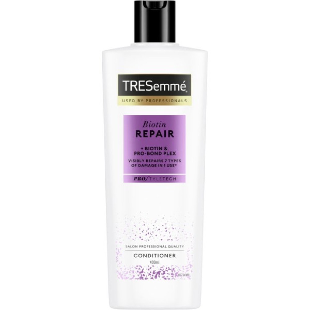 Біотин проникає глибоко в структуру волосся, реанімує пошкоджені ділянки, заповнює прогалини та згладжує розшаровані лусочки. Завдяки цьому усуває сухість, пористість, ламкість і сплутаність волосся. Після використання кондиціонера TRESemme волосся стає слухняним, гладким і шовковистим.