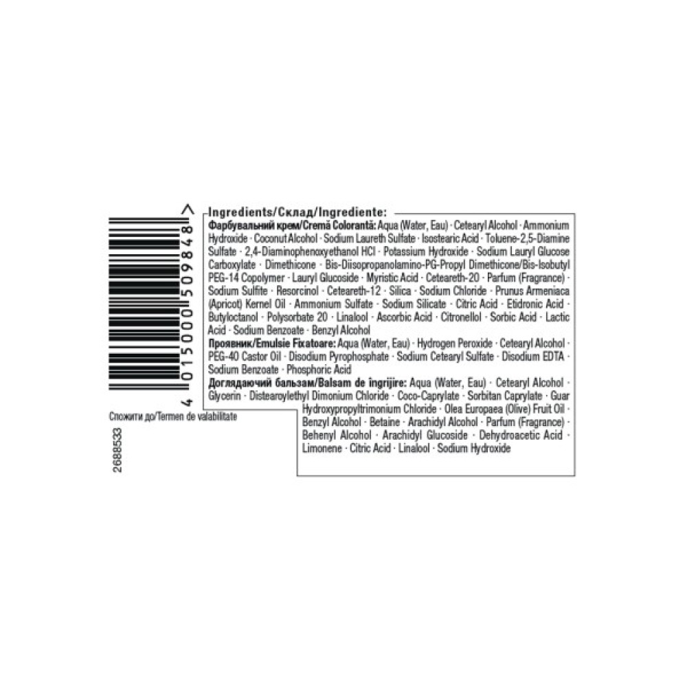 Крем для фарбування: Aqua (Water, Eau), Cetearyl Alcohol, Ammonium Hydroxide, Coconut Alcohol, Sodium Laureth Sulfate, Isostearic Acid, Ammonium Sulfate, Bis-Diisopropanolamino-PG-Propyl Dimethicone/Bis-Isobutyl PEG-14 Copolymer, Sodium Lauryl Glucose Carboxylate, Dimethicone, Potassium Hydroxide, Lauryl Glucoside, Myristic Acid, Ceteareth-20, Parfum (Fragrance), Ceteareth-12, Silica, Sodium Chloride, Prunus Armeniaca (Apricot) Kernel Oil, Sodium Silicate, Sodium Sulfite, Citric Acid, Etidronic