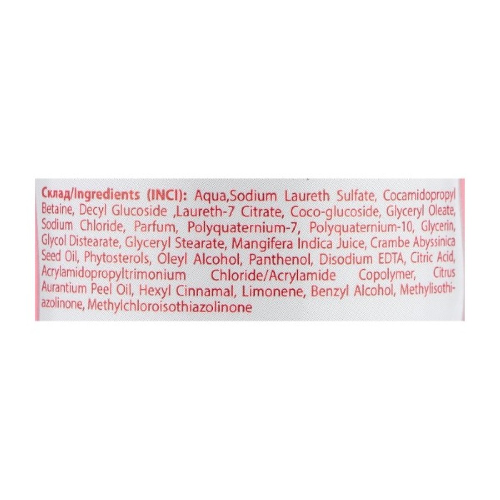 Склад Aqua, Sodium Laureth Sulfate, Cocamidopropyl Betaine, Decyl Glucoside,Laureth-7 Citrate, Coco-glucoside, Glyceryl Oleate, Sodium Chloride, Parfum, Polyquaternium-7, Polyquaternium-10, Glycerin, Glycol Distearate, Styrene/Acrylates Copolymer, Mangifera Indica Juice, Crambe Abyssinica Seed Oil, Phytosterols, Oleyl Alcohol, Panthenol, Disodium EDTA, Citric Acid, Acrylamidopropyltrimonium Chloride/Acrylamide Copolymer, Benzyl Alcohol, Methylisothiazolinone, Methylchloroisothiazolinone.