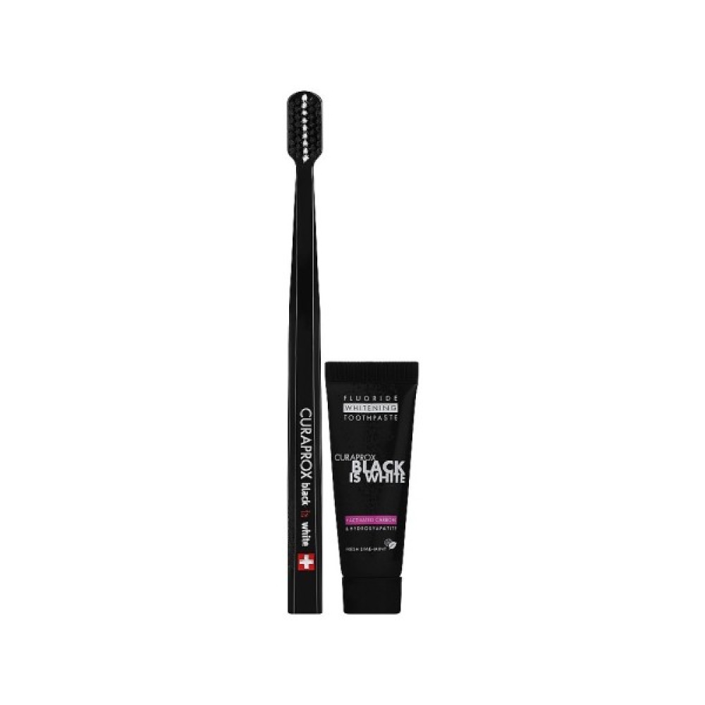 Склад набору: зубна паста з активованим вугіллям Curaprox Black is White – Curaprox, 10 мл + зубна щітка CS 5460 Ultra Soft – Curaprox