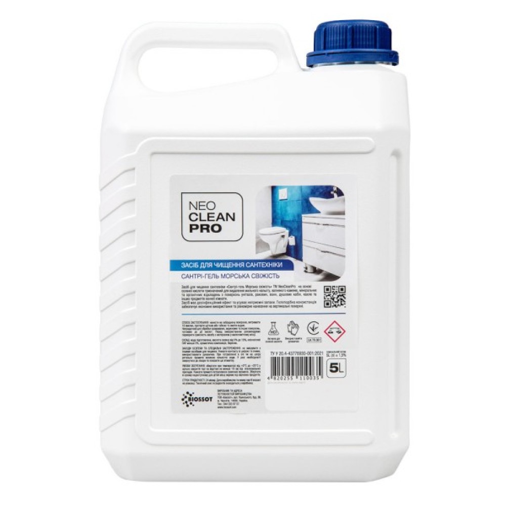 Засіб Biossot NeoCleanPro Сантрі-гель Морська свіжість на основі соляної кислоти. Призначений для видалення мильного нальоту, вапняного каменю, мінеральних та органічних відкладень з поверхонь унітазів, раковин, ванн, душових кабін, кахлю та інших предметів ванної кімнати.