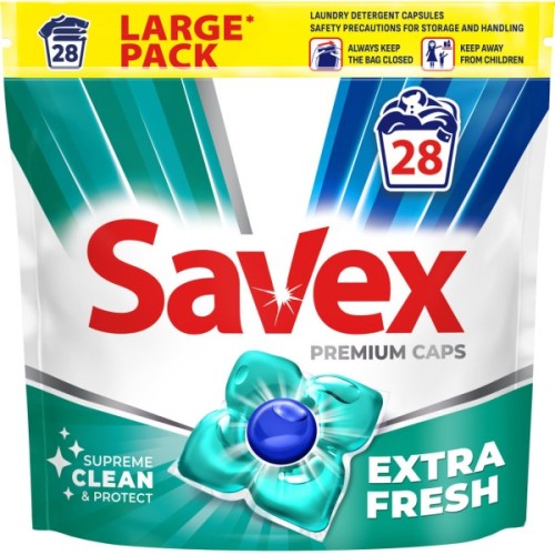 Новий Savex Super Caps з чудовою новою формулою. Активатором яскравості та підсилювачем активних компонентів. Має оптичний відбілювач, який робить білий колір помітно білішим, а інші кольори яскравішими завдяки спеціальному полімерному активатору фіолетового кольору.