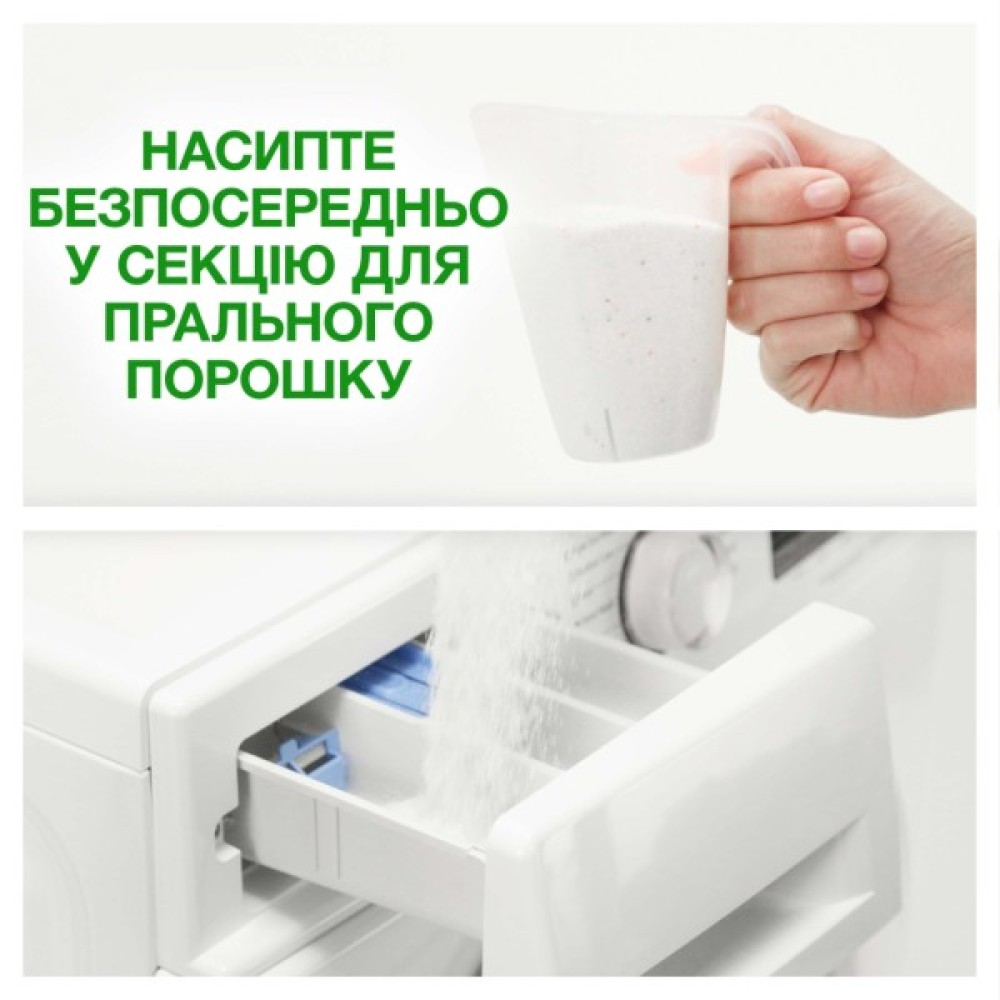 Спосіб застосування Помістіть необхідну дозу порошку в пральну машину, завантажте білизну і включіть прання.