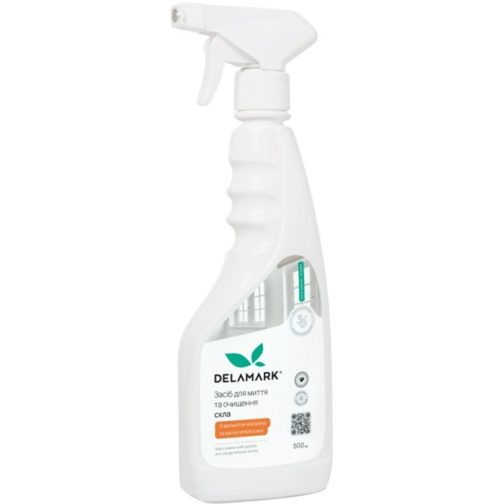 Концентрований засіб для миття та очищення скла DeLaMark із вишуканим ароматом жасмину та апельсинової квітки дуже економний та має зручну упаковку з розпилювачем.