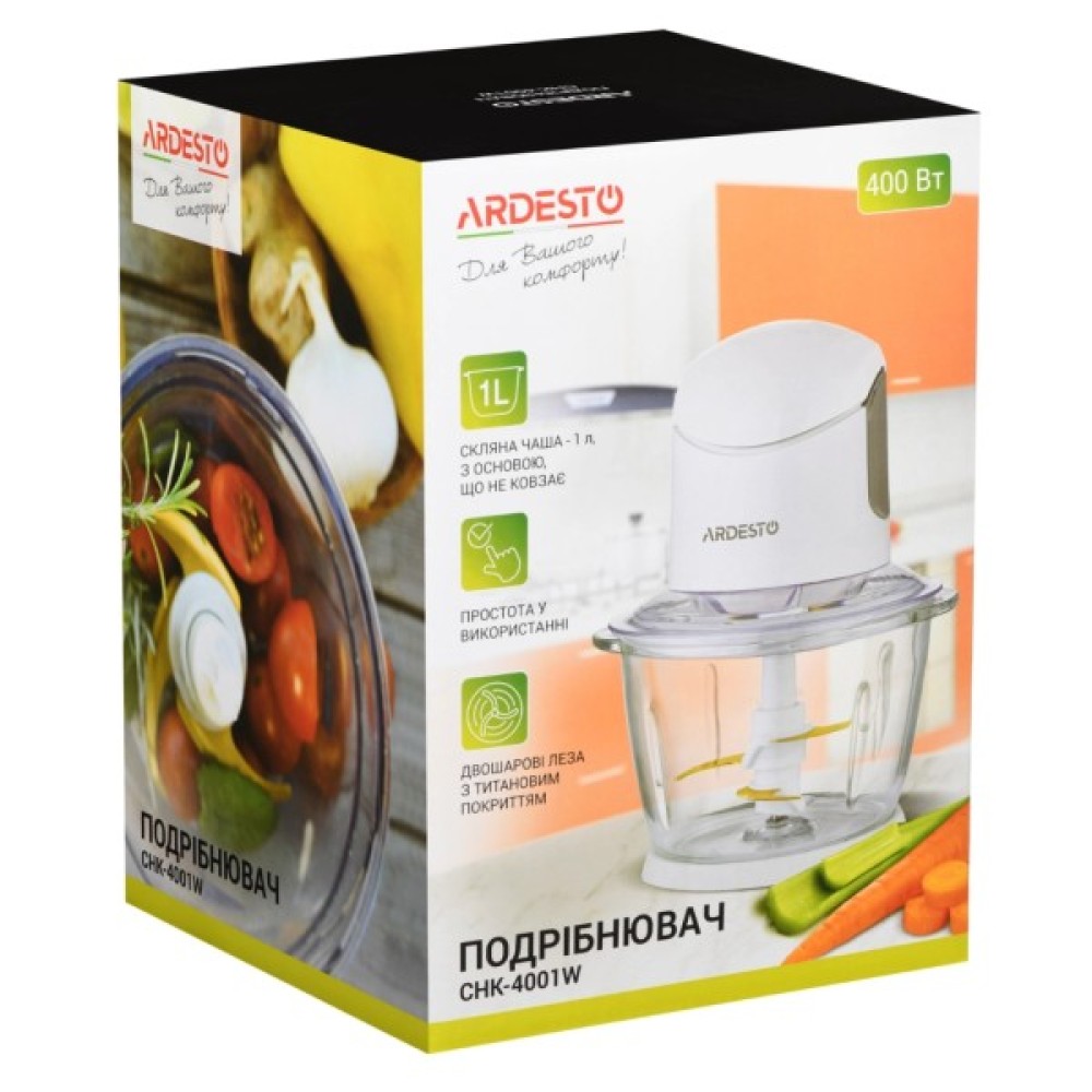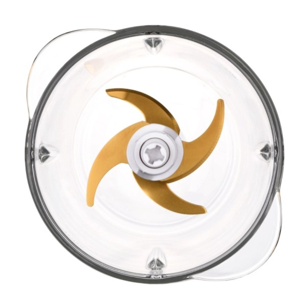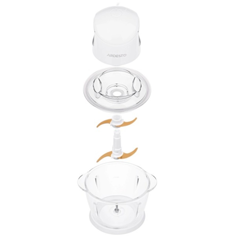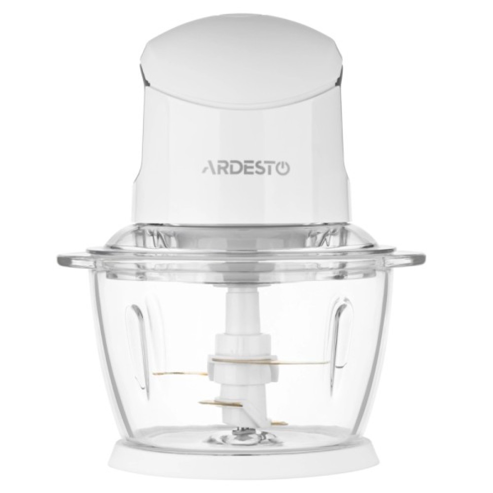 Компактний чоппер білого кольору для швидкого подрібнення інгредієнтів та приготування різноманітних соусів. У комплектацію входить скляна чаша та подвійні ножі.