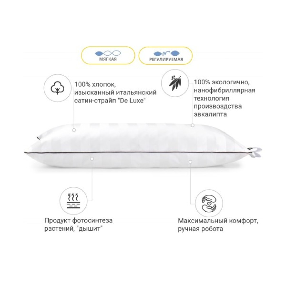 Низька — оптимально розрахована вага наповнювача для досягнення гарних показників за пружністю. Ця висота прекрасно підійде людям, які люблять низькі та дуже м'які подушки. Рекомендовано для дітей і жінок. Також не хочеться втратити можливість підкреслити величезний плюс подушок — вони регульовані! Вся принадність у тому, що в подушці є вбудована блискавка (вона розмішена збоку подушки), завдяки якій ви в будь-який момент зможете вийняти трохи наповнювача та підлаштувати подушку повністю під себе.