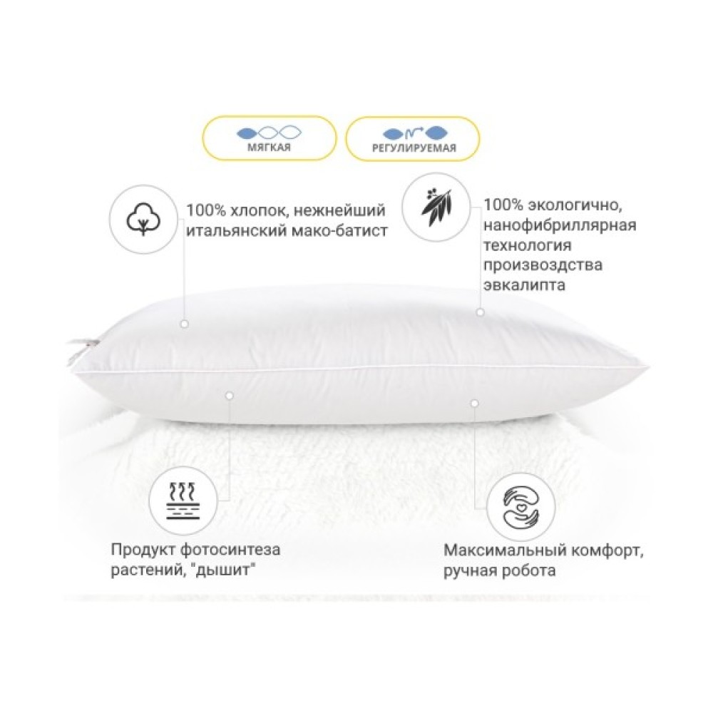 Низька — оптимально розрахована вага наповнювача для досягнення гарних показників за пружністю. Ця висота прекрасно підійде людям, які люблять низькі та дуже м'які подушки. Рекомендовано для дітей і жінок. Також не хочеться втратити можливість підкреслити величезний плюс подушок — вони регульовані! Вся принадність у тому, що в подушці є вбудована блискавка (вона розмішена збоку подушки), завдяки якій ви в будь-який момент зможете вийняти трохи наповнювача та підлаштувати подушку повністю під себе.