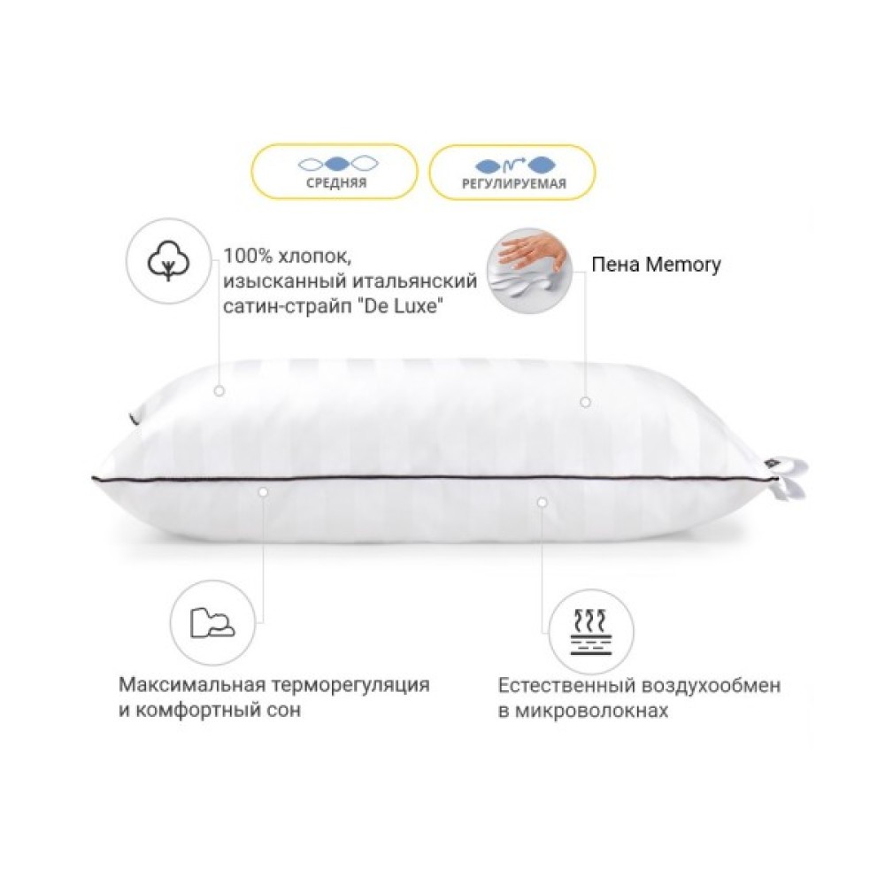 Середня — оптимально розрахована вага наповнювача для досягнення гарних показників з пружності. Ця висота прекрасно підійде людям, які люблять середні, у міру пружні подушки. Подушку можна віднести до розряду стандартних, середніх за м'якістю та висотою. Також не хочеться втратити можливість підкреслити величезний плюс подушок — вони регульовані! Вся принадність у тому, що в подушці є вбудована блискавка (вона розмішена збоку подушки), завдяки якій ви в будь-який момент зможете вийняти трохи наповнювача та підлаштувати подушку повністю під себе.
