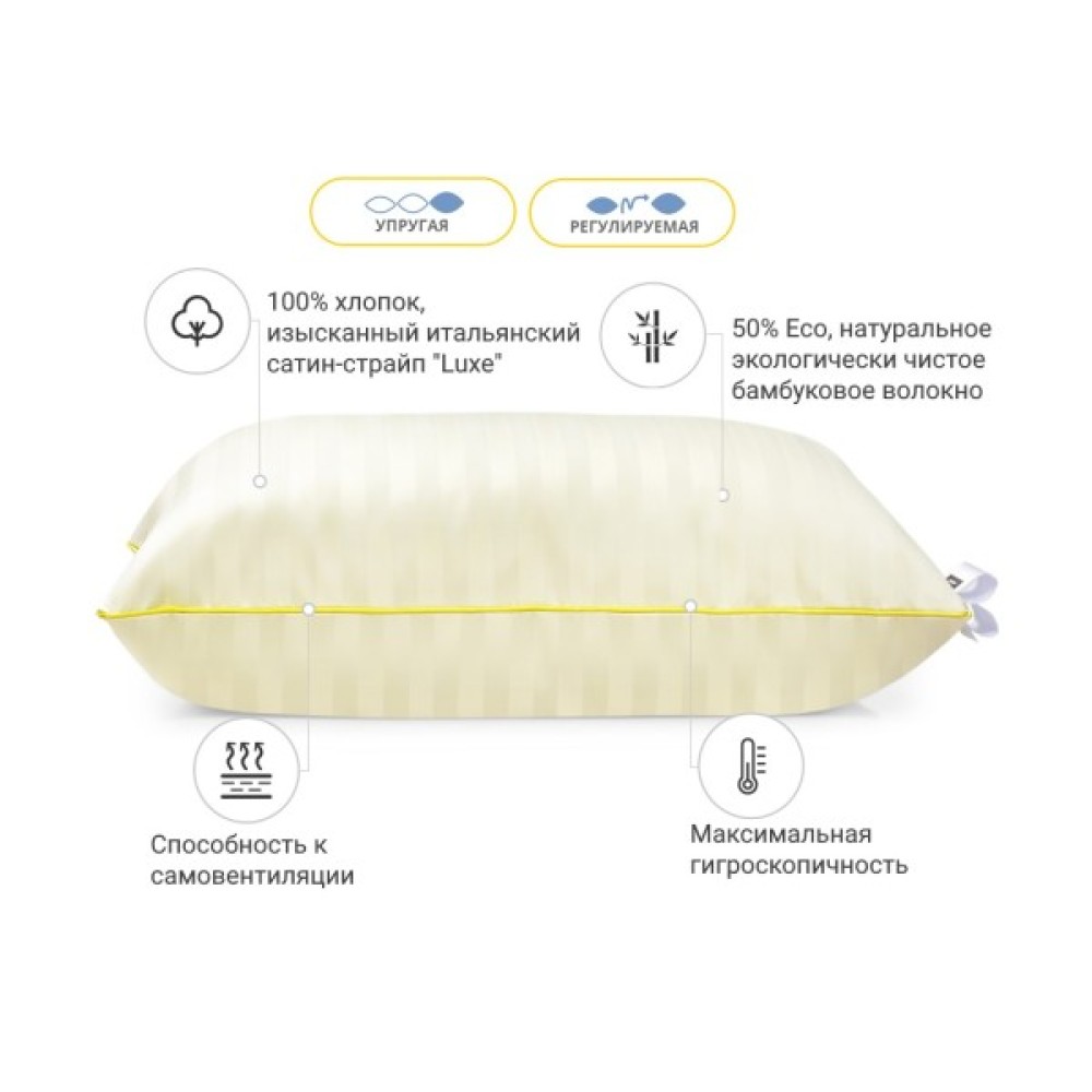 Особливості подушки: бамбукова подушка колекції Carmela Hand Made виготовлена з антиалергенного бамбукового волокна й італійського сатину, до складу якого входить 100% бавовна, яка дає змогу тілу дихати, дарує легкість і простоту в догляді. Ця подушка належить до розряду — пружна, де оптимально розрахована вага наповнювача для досягнення гарних показників за пружністю. Також не хочеться втратити можливість підкреслити величезний плюс цієї подушки — вона регульована! Вся принада у тому, що в подушці є вбудована блискавка (вона розміщена збоку подушки), завдяки якій Ви в будь-який момент зможете вийняти трохи наповнювача та зробити подушку нижчою. Хочете знову зробити високою? Поверніть наповнювач на місце — і подушка набуде колишню пружність.