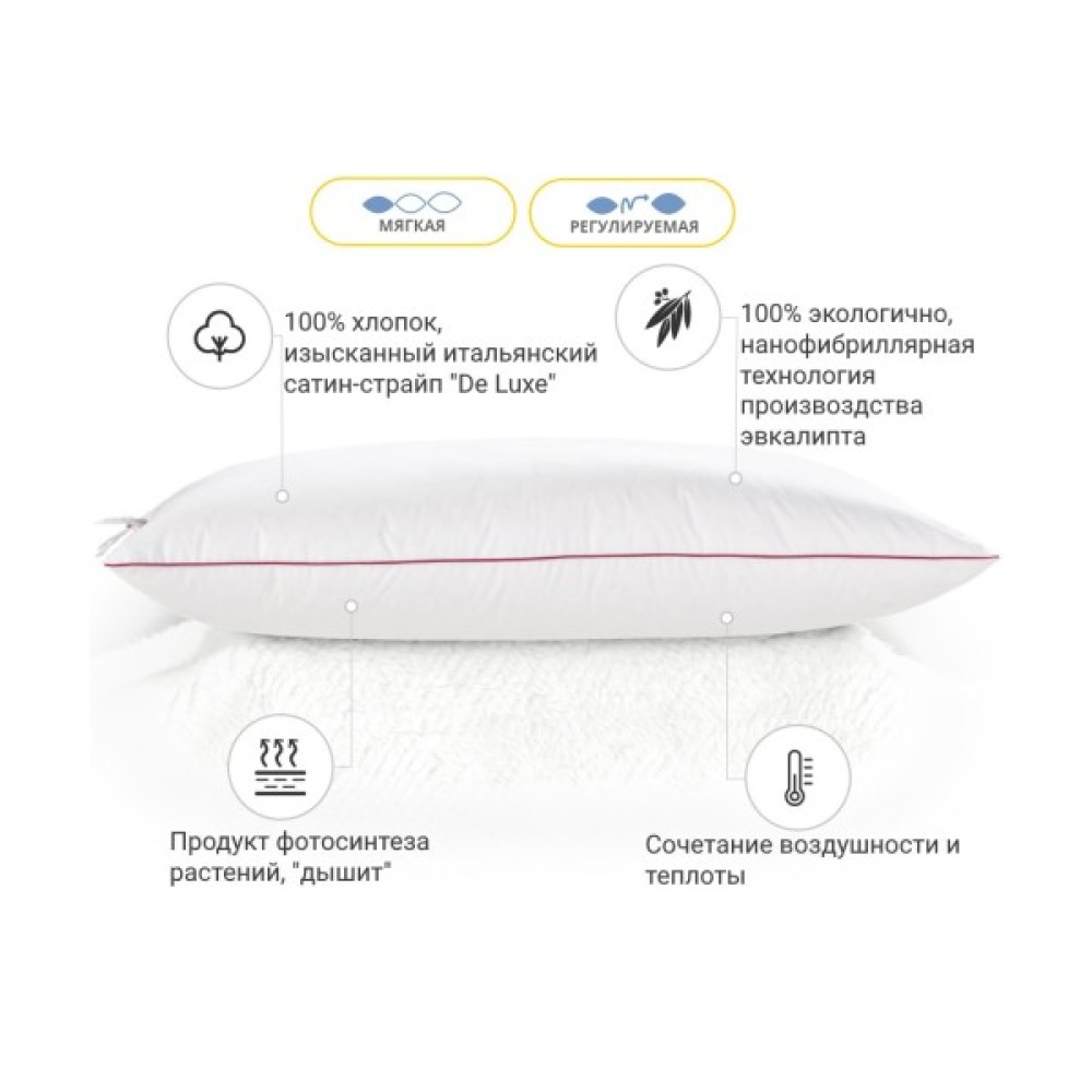 Середня — оптимально розрахована вага наповнювача для досягнення добрих показників за пружністю. Ця висота прекрасно підійде людям, які люблять середні, у міру пружні подушки. Подушку можна віднести до розряду стандартних, середніх за м'якістю та висотою. Також не хочеться втратити можливість підкреслити величезний плюс подушок — вони регульовані! Вся принадність у тому, що в подушці є вбудована блискавка (вона розмішена збоку подушки), завдяки якій ви в будь-який момент зможете вийняти трохи наповнювача та підлаштувати подушку повністю під себе.