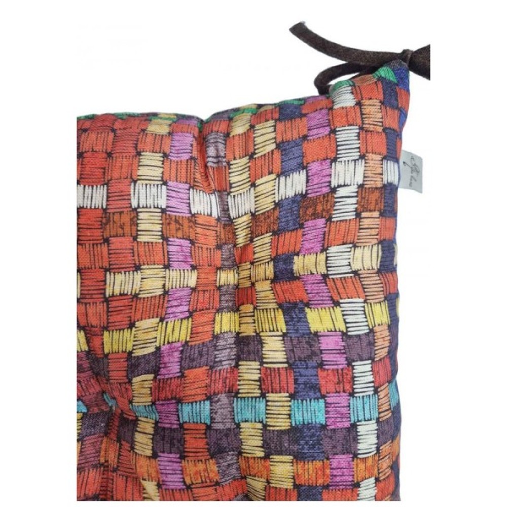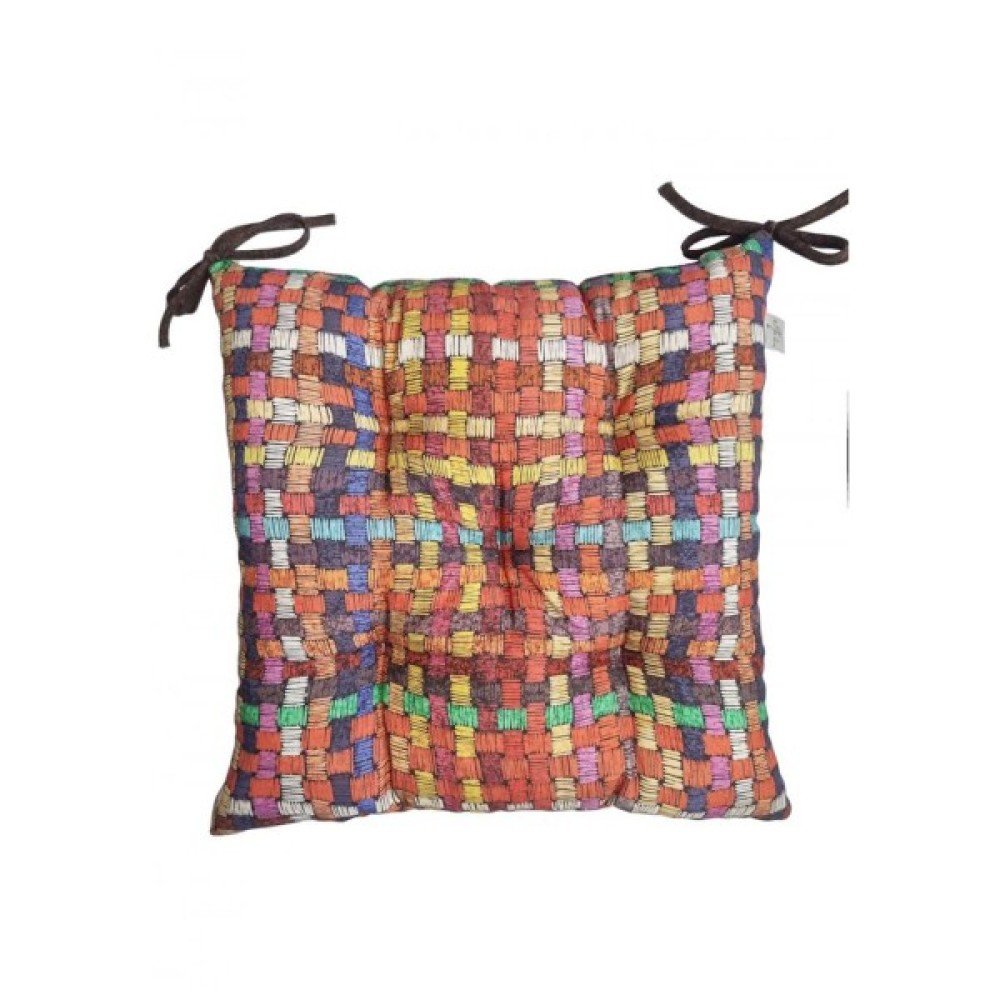 Квадратна подушка з різнокольоровим геометричним принтом. Подушка чудово доповнить інтер'єр, а також зробить сидіння стільця більш м'яким і комфортним. Подушка виконана з якісної і практичної іспанської тканини на основі бавовни і поліестеру, з наповнювачем із холофайбера. Виріб кріпиться до стільця за допомогою двох зав'язок.