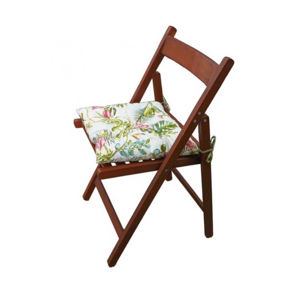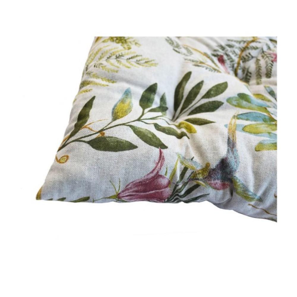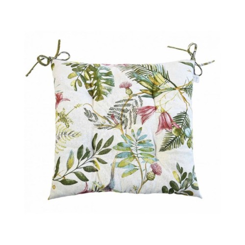 Квадратна подушка з красивим квітковим принтом з обох боків. Подушка чудово доповнить інтер'єр, а також зробить сидіння стільця м'якшим і комфортнішим. Подушка виконана з якісної та практичної іспанської тканини на основі бавовни та поліестеру, з наповнювачем з холофайберу. Виріб кріпиться до стільця за допомогою двох зав'язок.
