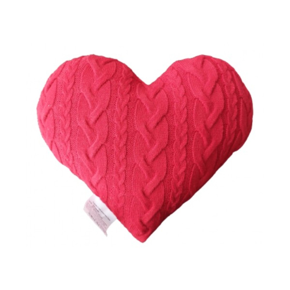 В'язана однотонна подушка червоного кольору у формі серця. Подушка з красивими рельєфними кісками. Подушка-серце створить в інтер'єрі атмосферу романтики та гармонії. З одного боку подушки - трикотажне в'язане полотно з бавовни і акрилу, а з іншого - натуральна бавовняна тканина. Як наповнювач використовується поліефірне антиалергенне волокно холлофайбер.