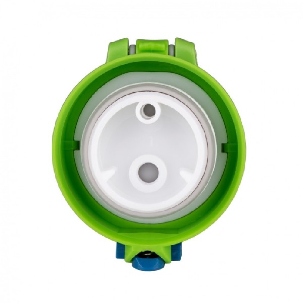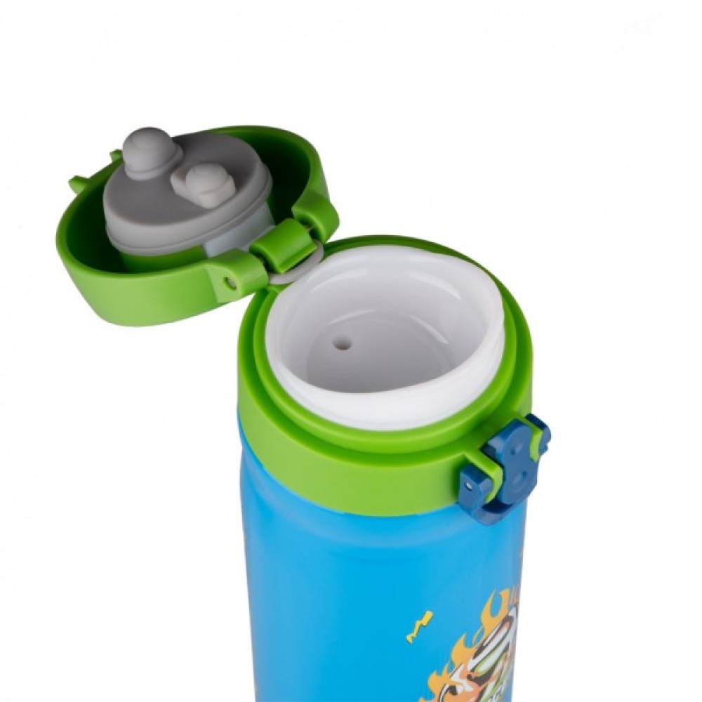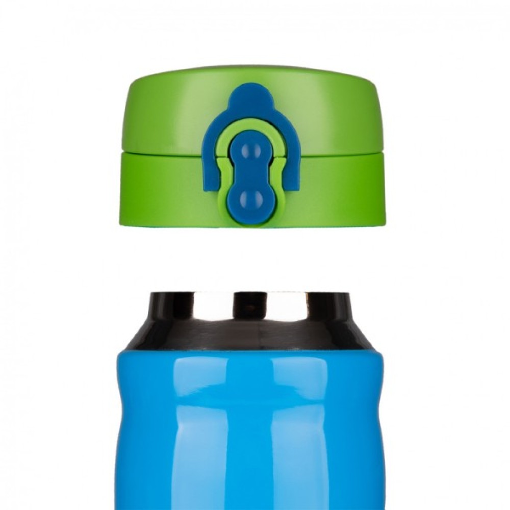 Відкидна кришка зручно відкривається однією рукою за допомогою кнопки, а додатковий фіксатор запобігає протіканню. Має силіконові елементи, що забезпечують герметичність.