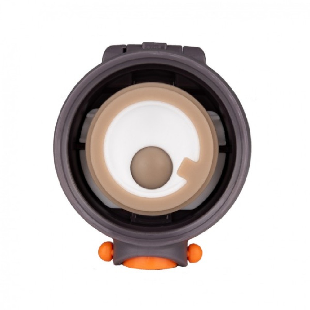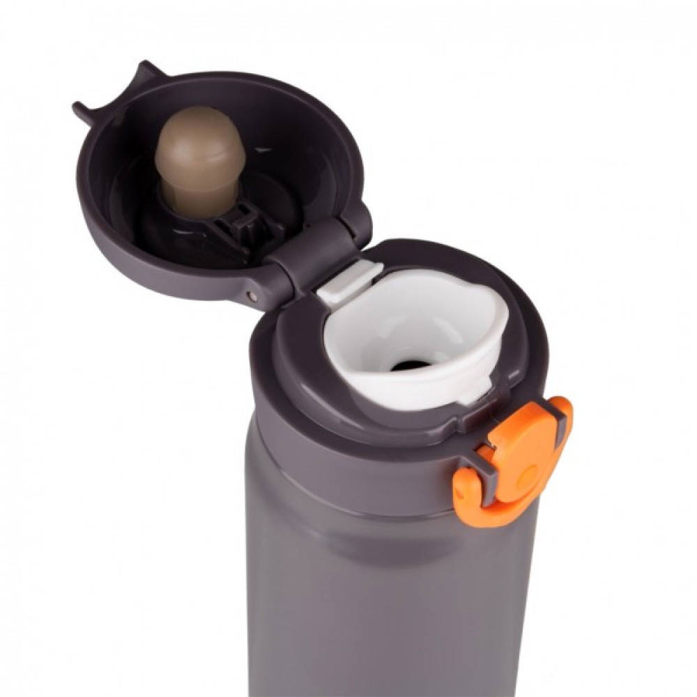 Відкидна кришка зручно відкривається однією рукою за допомогою кнопки, а додатковий фіксатор запобігає протіканню. Має силіконові елементи, що забезпечують герметичність.