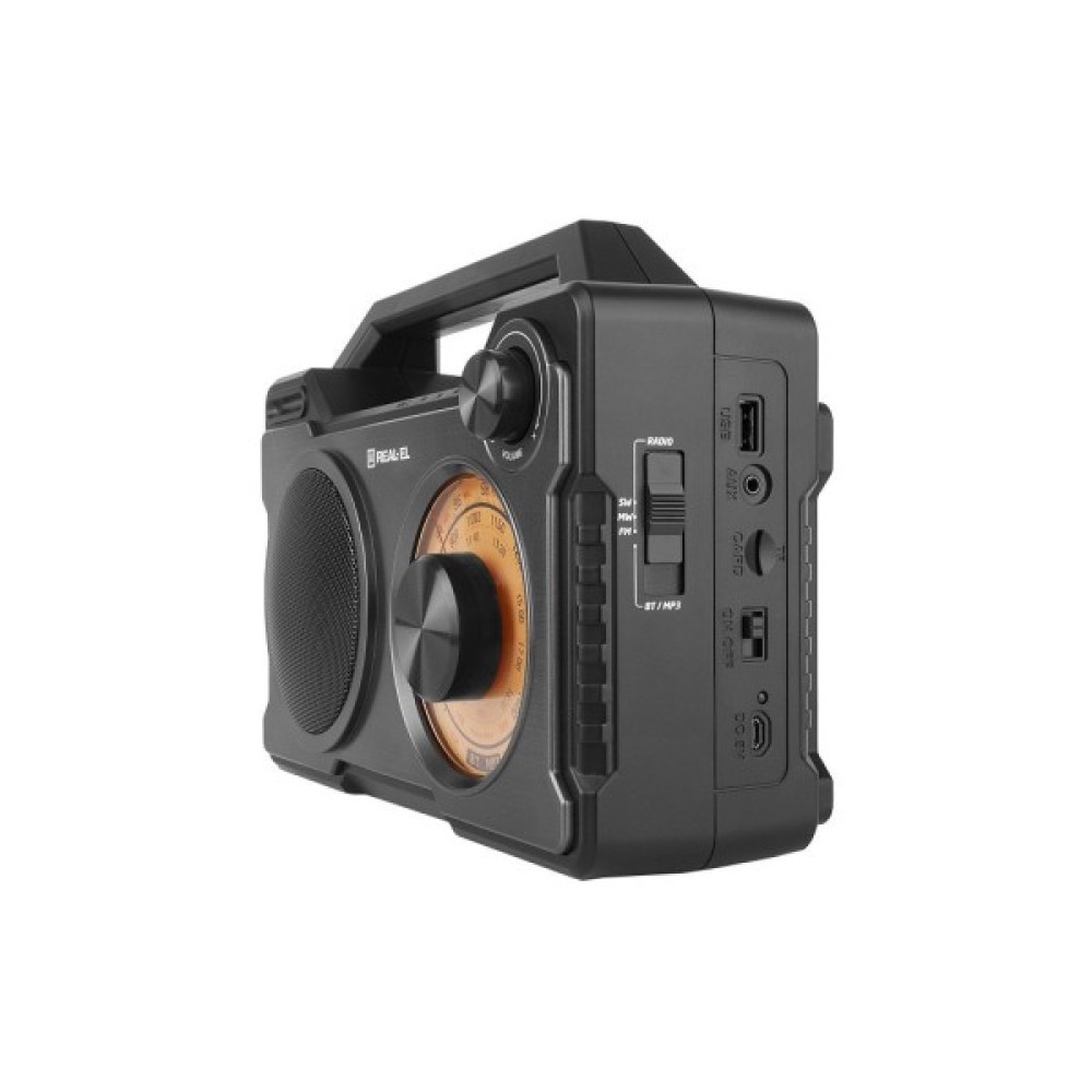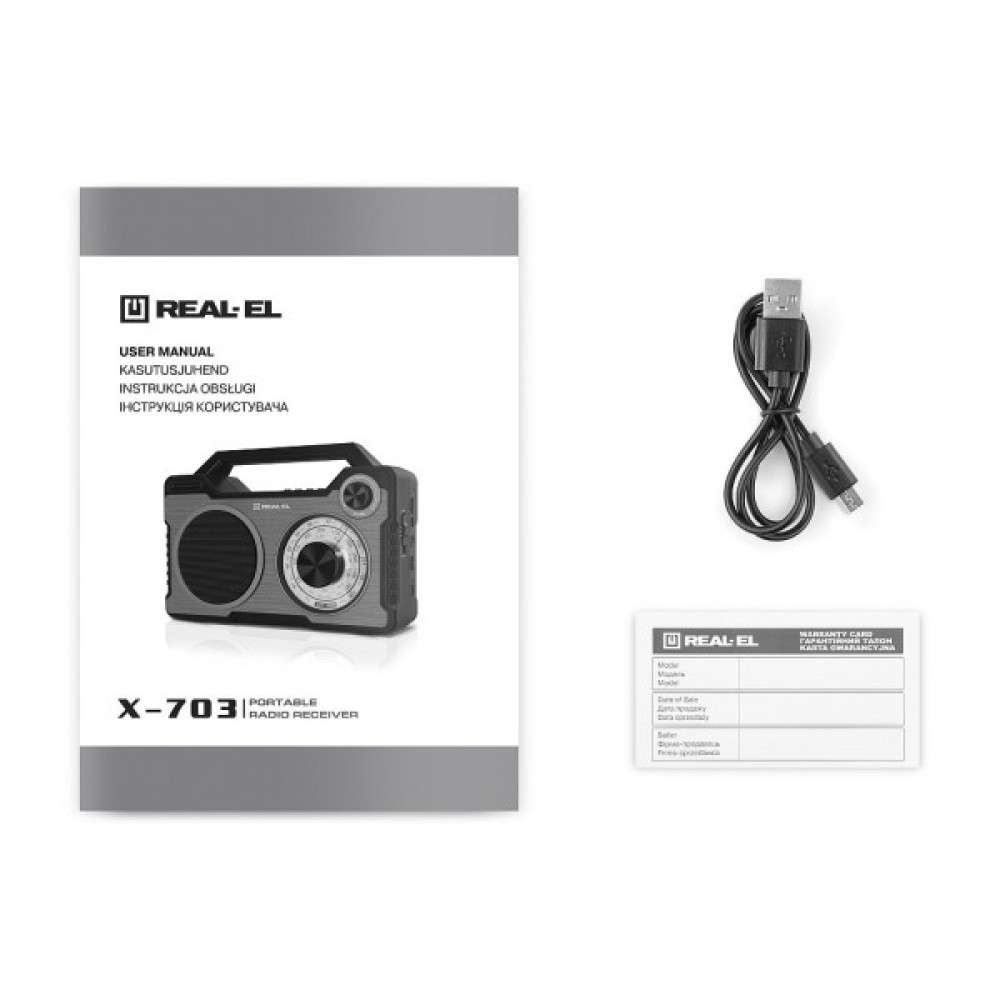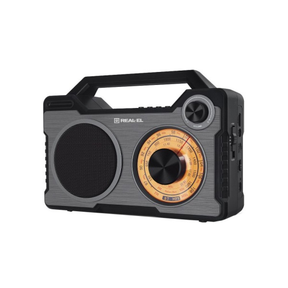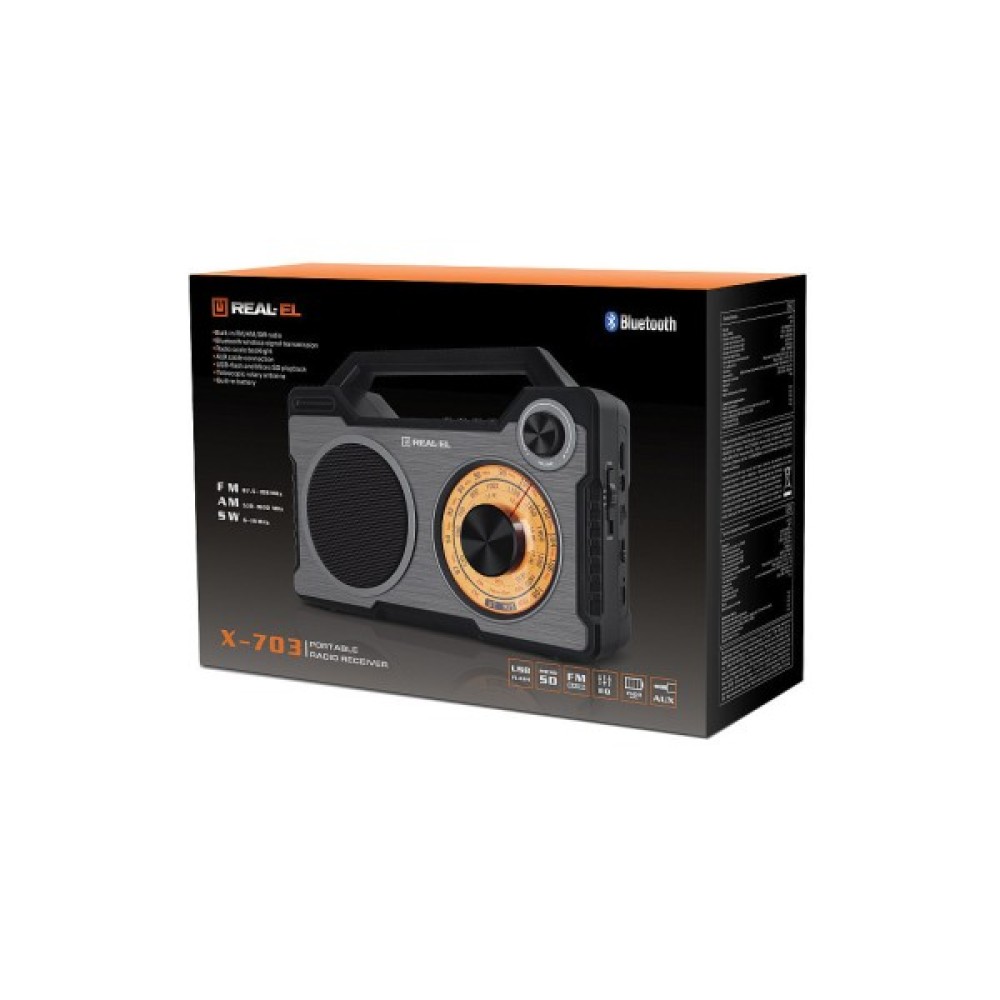 Портативний радіоприймач REAL-EL X-703 – чудовий супутник для поїздок, подорожей та прогулянок, а також відмінний компаньйон будинку та роботи. Крім того, Ви можете взяти з собою улюблені FM-радіостанції будь-куди. До моделі приймача додані і сучасні опції, а саме відтворення з USB-flash та microSD card носіїв, а також Bluetooth-з'єднання.