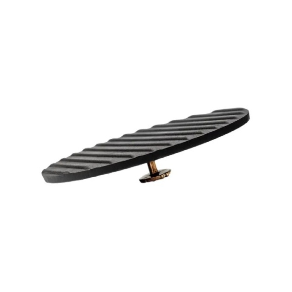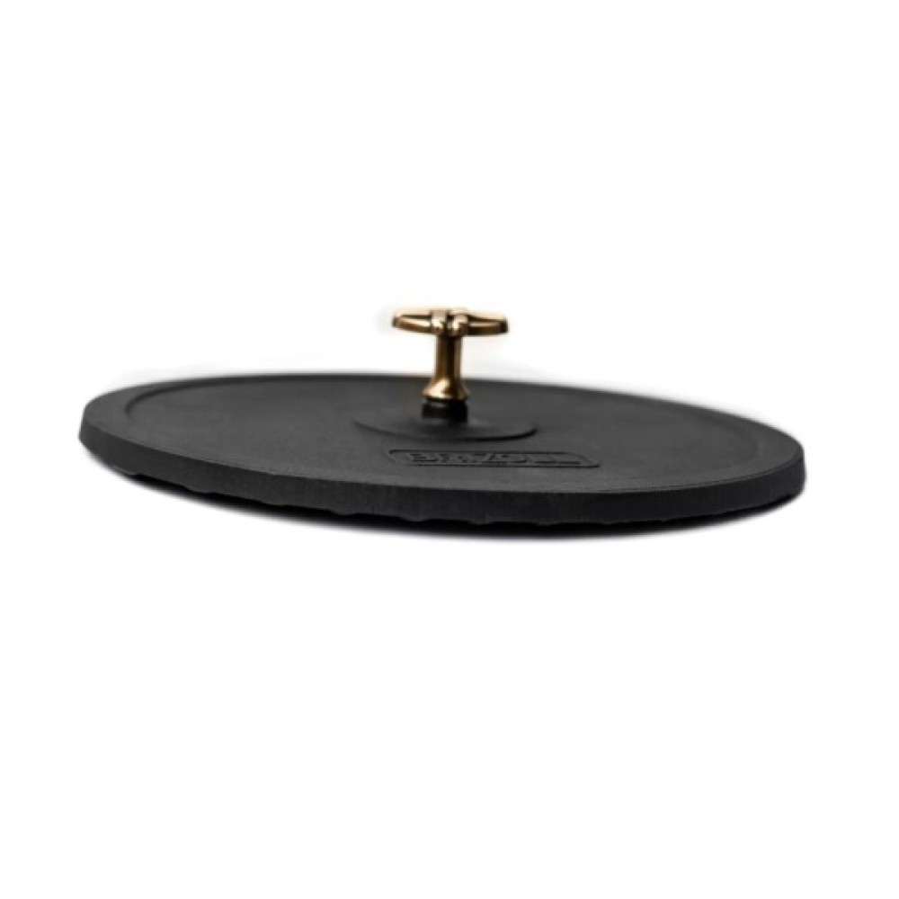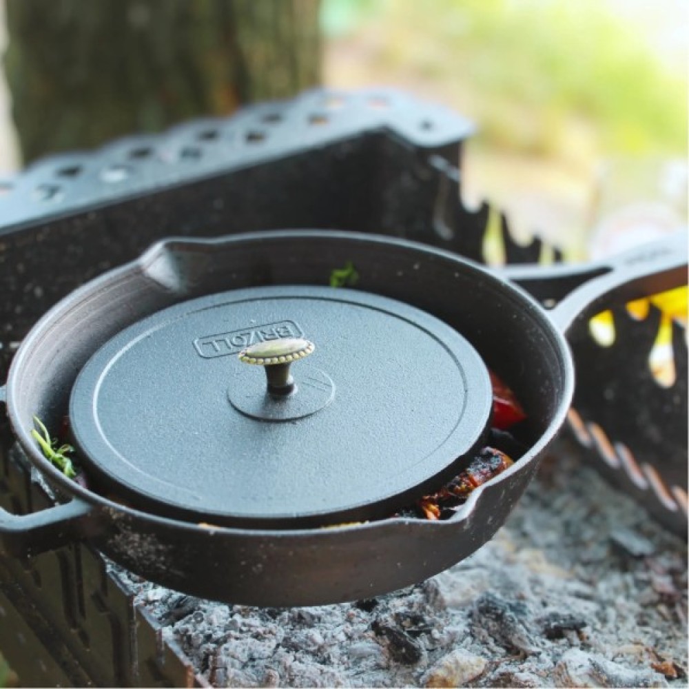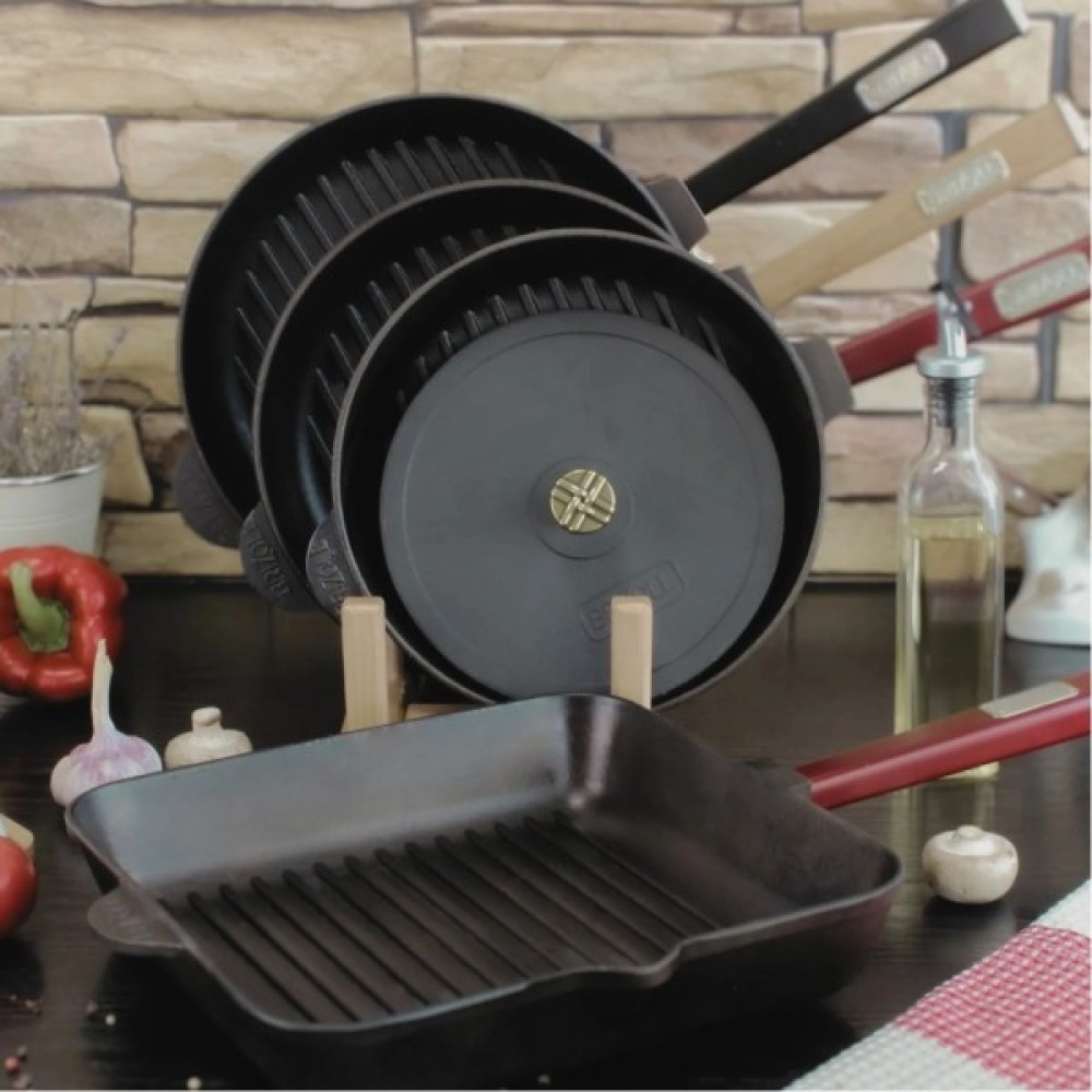 Однозначно корисним доповненням до чавунної сковороди буде спеціальний притиск. Це важка плоска кришка меншого розміру, яка не накриває посуд, а притискає страву в процесі приготування до дна.