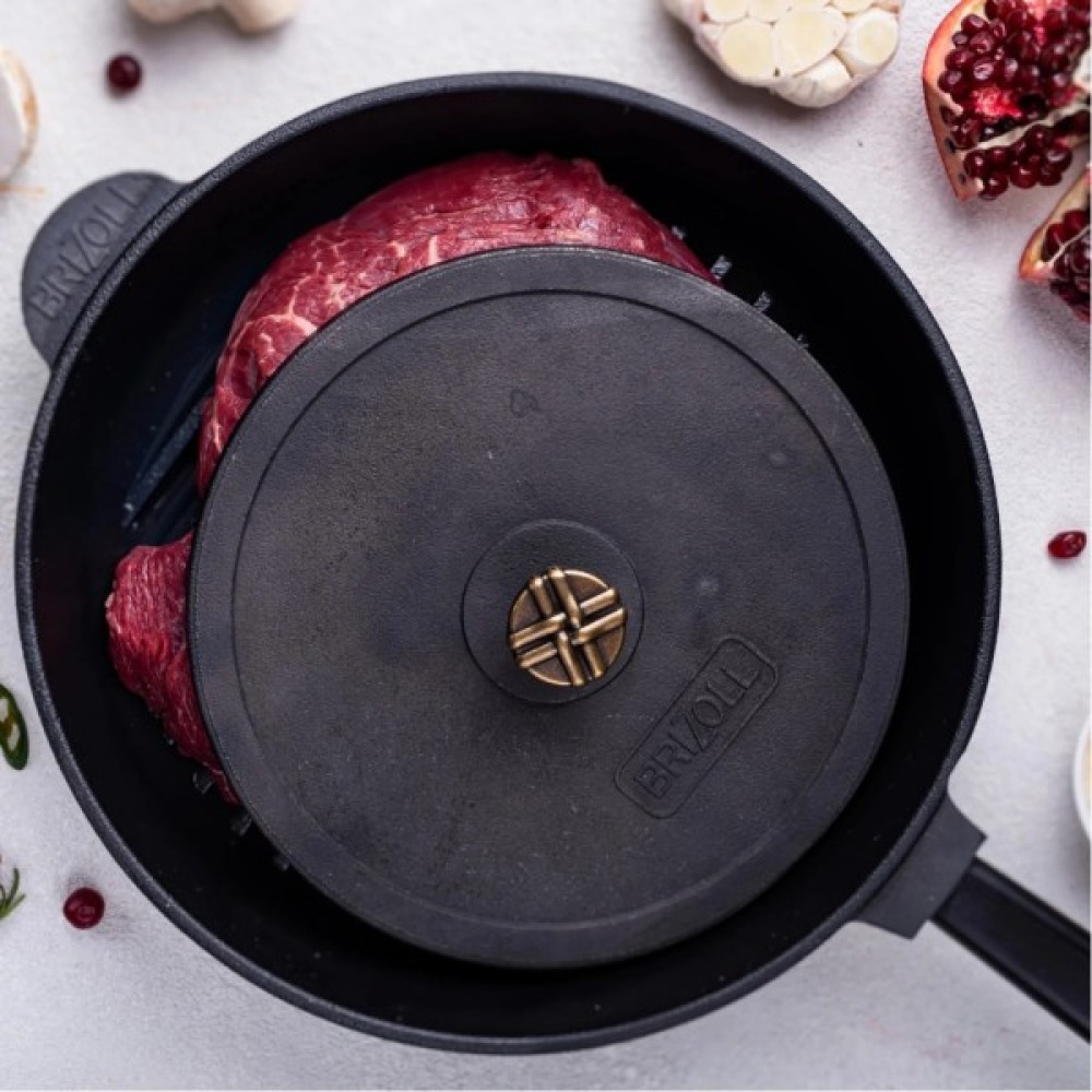 Притиск TM BRIZOLL виготовлений із чавуну і добре тримає тепло. Якщо перед використанням притиск попередньо нагріти і тільки після цього покласти на м'ясо, це дасть змогу прискорити приготування. Нагрівання здійснюватиметься одночасно з двох сторін, що дещо скоротить час смаження.