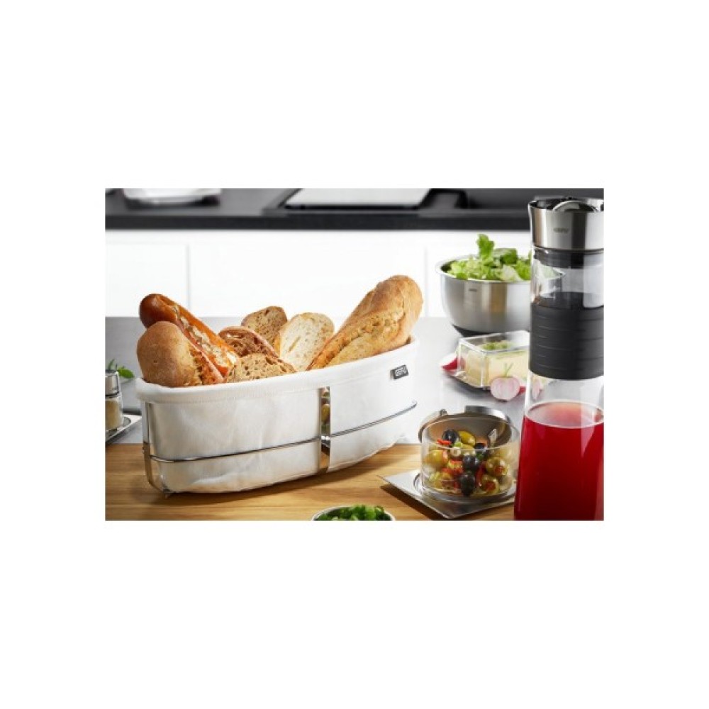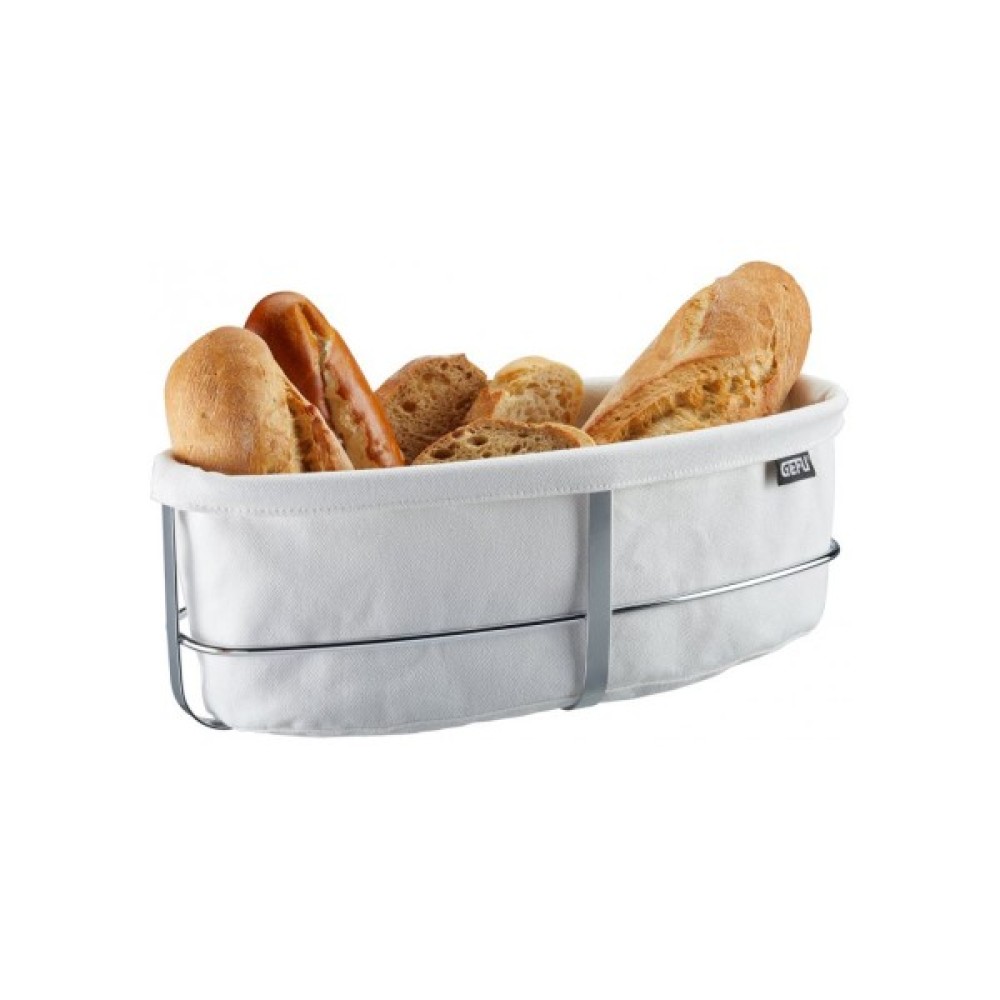 Хлібний кошик GEFU BRUNCH, овальний, білий — це ідеальний аксесуар для сервірування хрустких багетів, хліба та булочок. Корзина виготовлена з високоякісної нержавіючої сталі, що надає їй елегантного та сучасного вигляду, який чудово пасує до вишуканої кухні. Тканинна вставка з бавовни легко знімається та переться за температури до 30°C. Металевий каркас можна мити в посудомийній машині. Ідеальна ємність для хрустких багетів, хліба та булочок – і не лише на сніданковому столі!