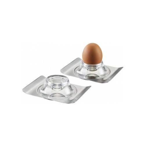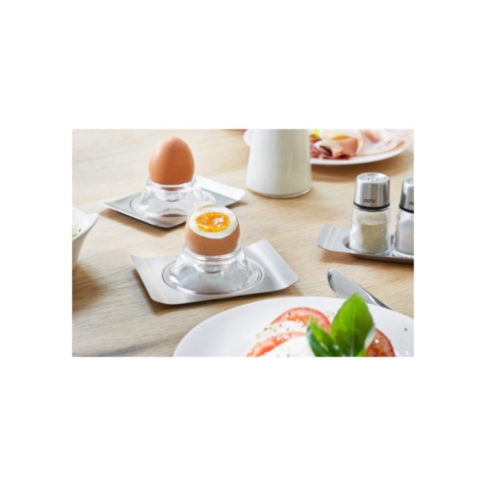 Набір з 2 прозорих підставок для яєць серії Brunch від німецького бренду Gefu поєднує функціональність і красиву форму. Підставка із прозорого САН-пластику стоїть на елегантно вигнутому блюдце, яке також можна використовувати для пляшок, чашок або склянок. Крім того, підставки можна штабелювати для економії місця: вони функціональні та добре продумані.