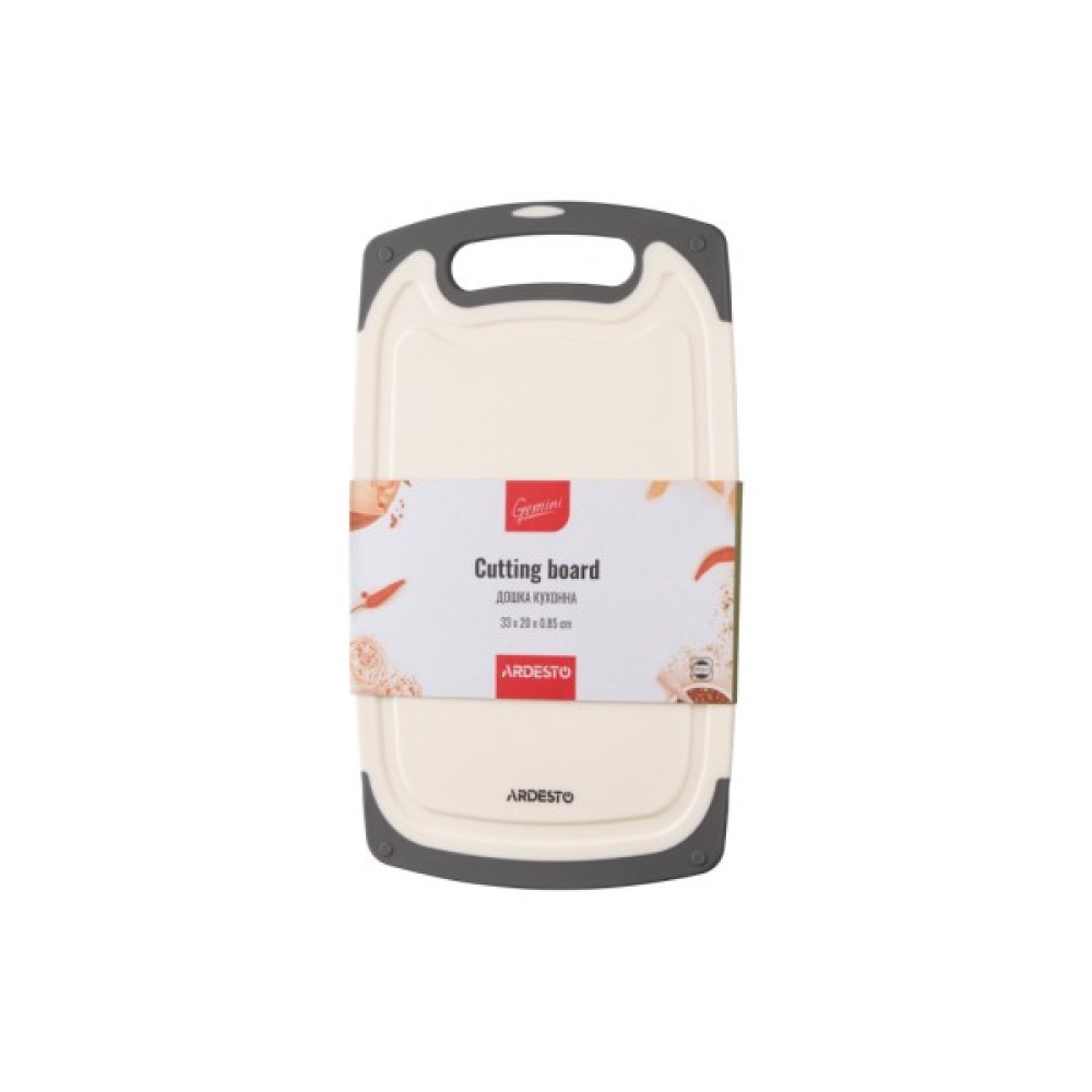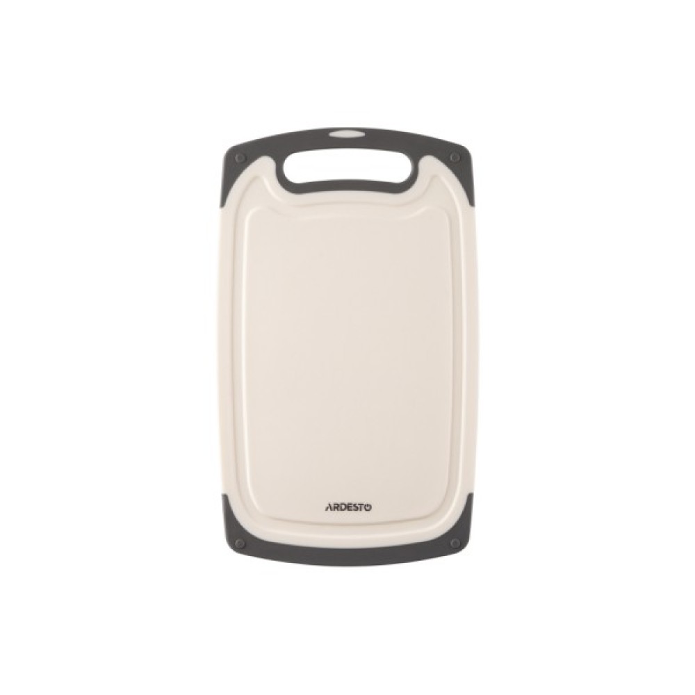 Кухонна дошка з жолобом має прямокутну форму із закругленими кутами. Її виготовлено з пластику білого кольору. Має протиковзкий борт із термостійкої гуми чорного кольору. Для зручності під час користування передбачено отвір, за нього можна повісити аксесуар на гачок. Можна мити в посудомийній машині.