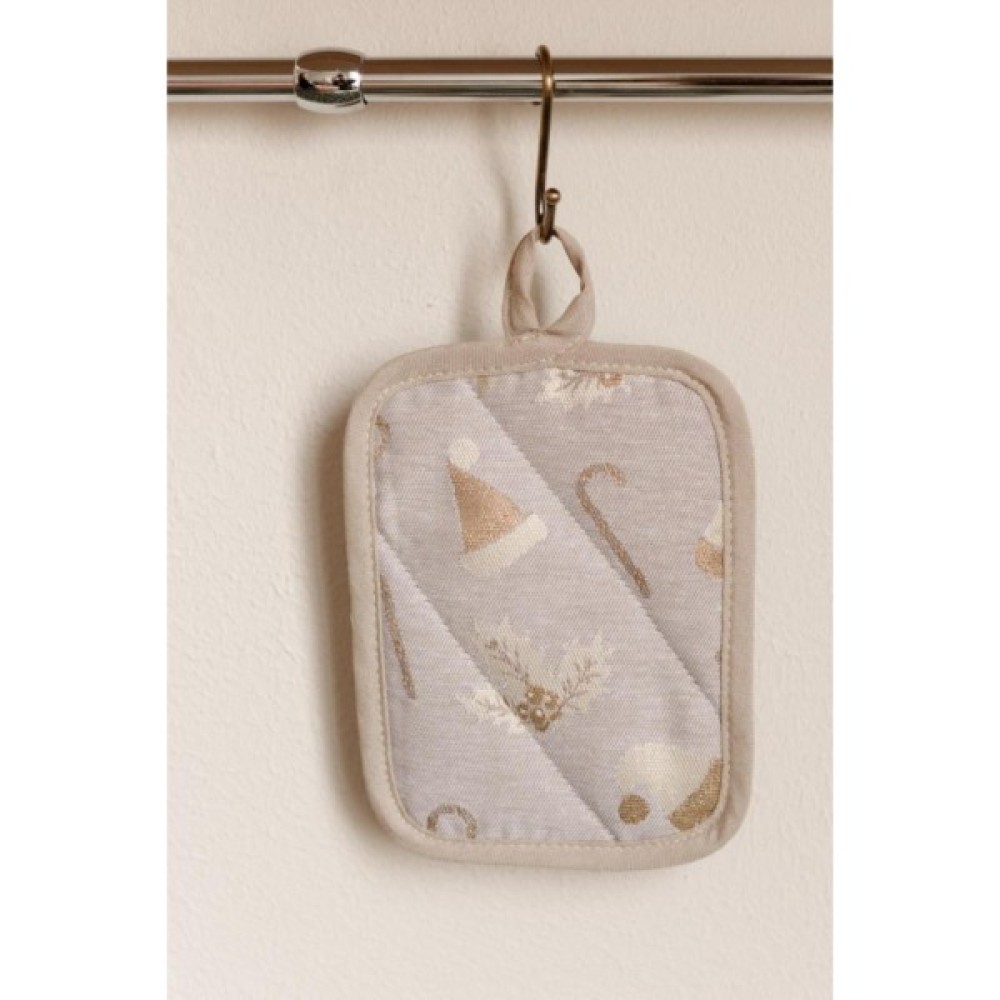 Прихватка розміром 15х20 см зі зручною петелькою для підвішування. Прихватка бежевого кольору з симпатичним золотистим принтом, подарує святковий настрій, чудово впишеться в інтер'єр кухні. Якісний іспанський жакард з бавовни та поліестеру прослужить вам довгий час, зберігши первісний колір і вигляд.