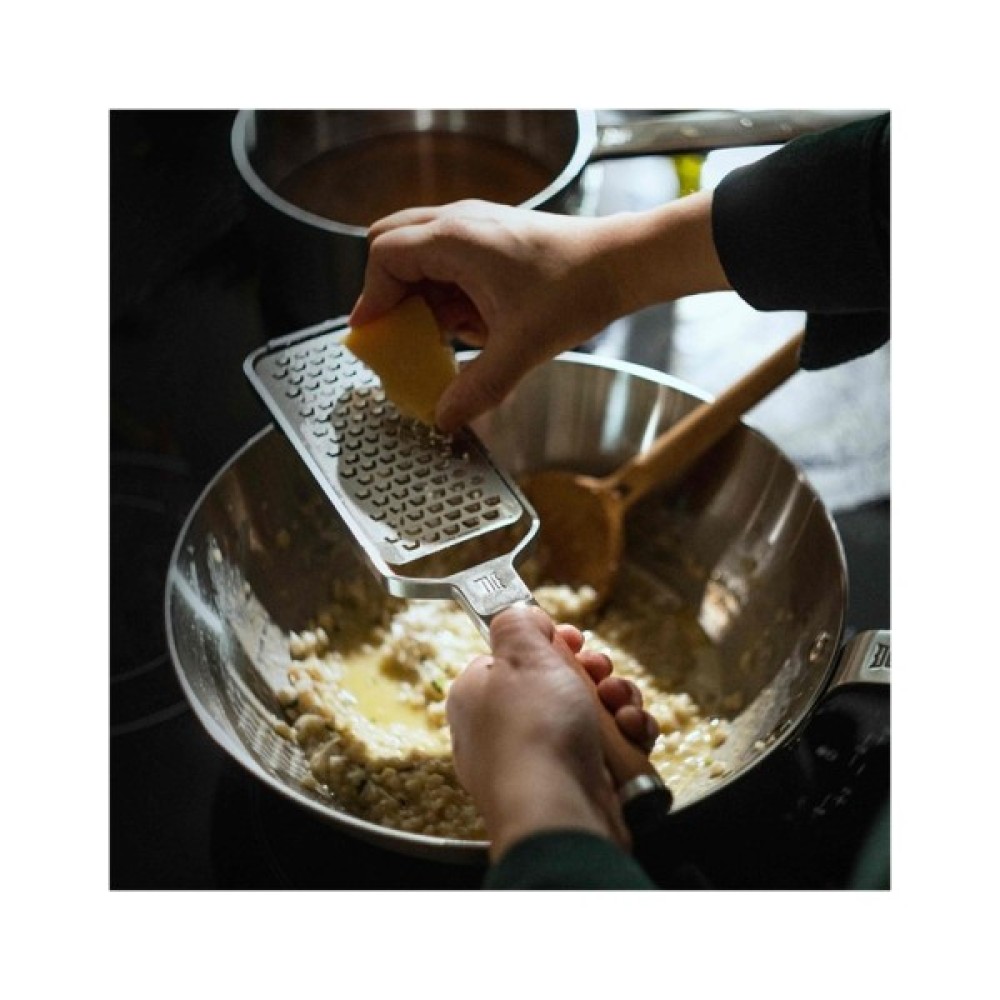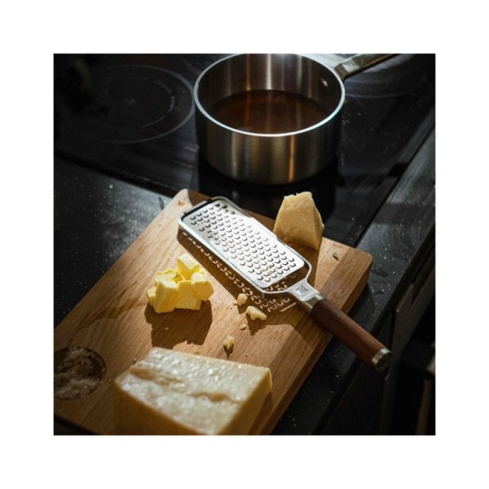Нержавіюча тертка ідеально підходить для грубої терки овочів, таких як морква, м'якого сиру та імбиру. Її ручка виготовлена з високоякісного термічно обробленого березового дерева, яке походить з екологічно чистих лісів.