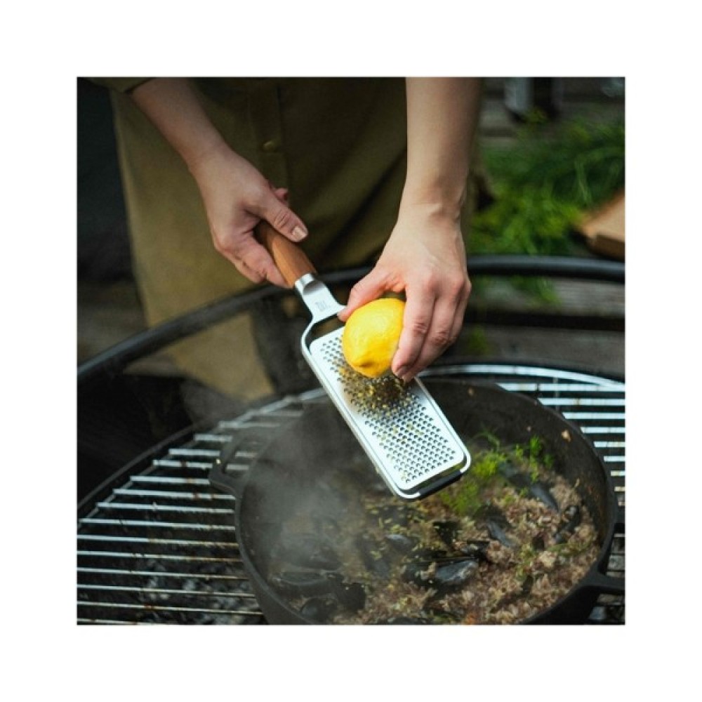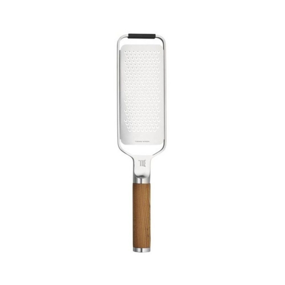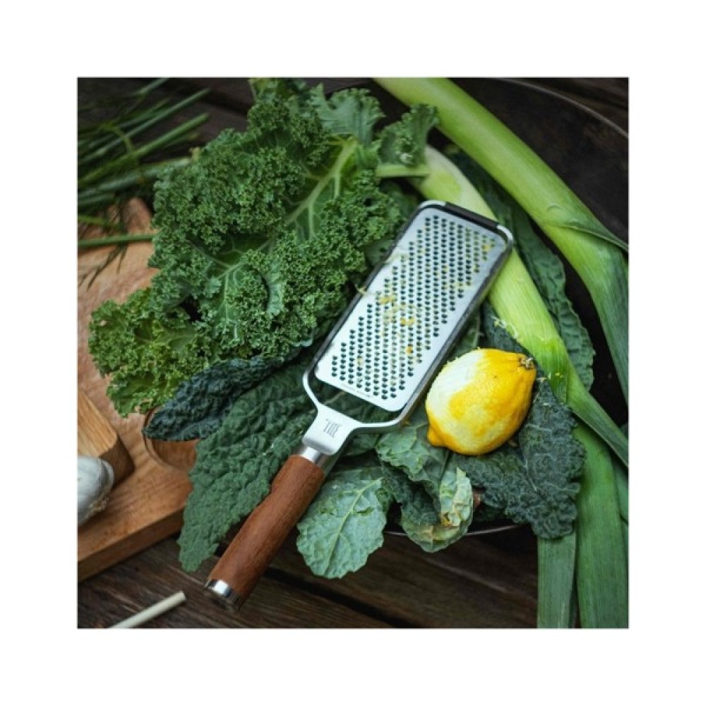 Нержавіюча тертка ідеально підходить для грубої терки овочів, таких як морква, м'якого сиру та імбиру. Її ручка виготовлена з високоякісного термічно обробленого березового дерева, яке походить з екологічно чистих лісів.