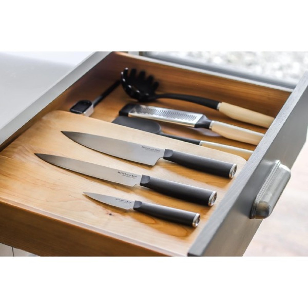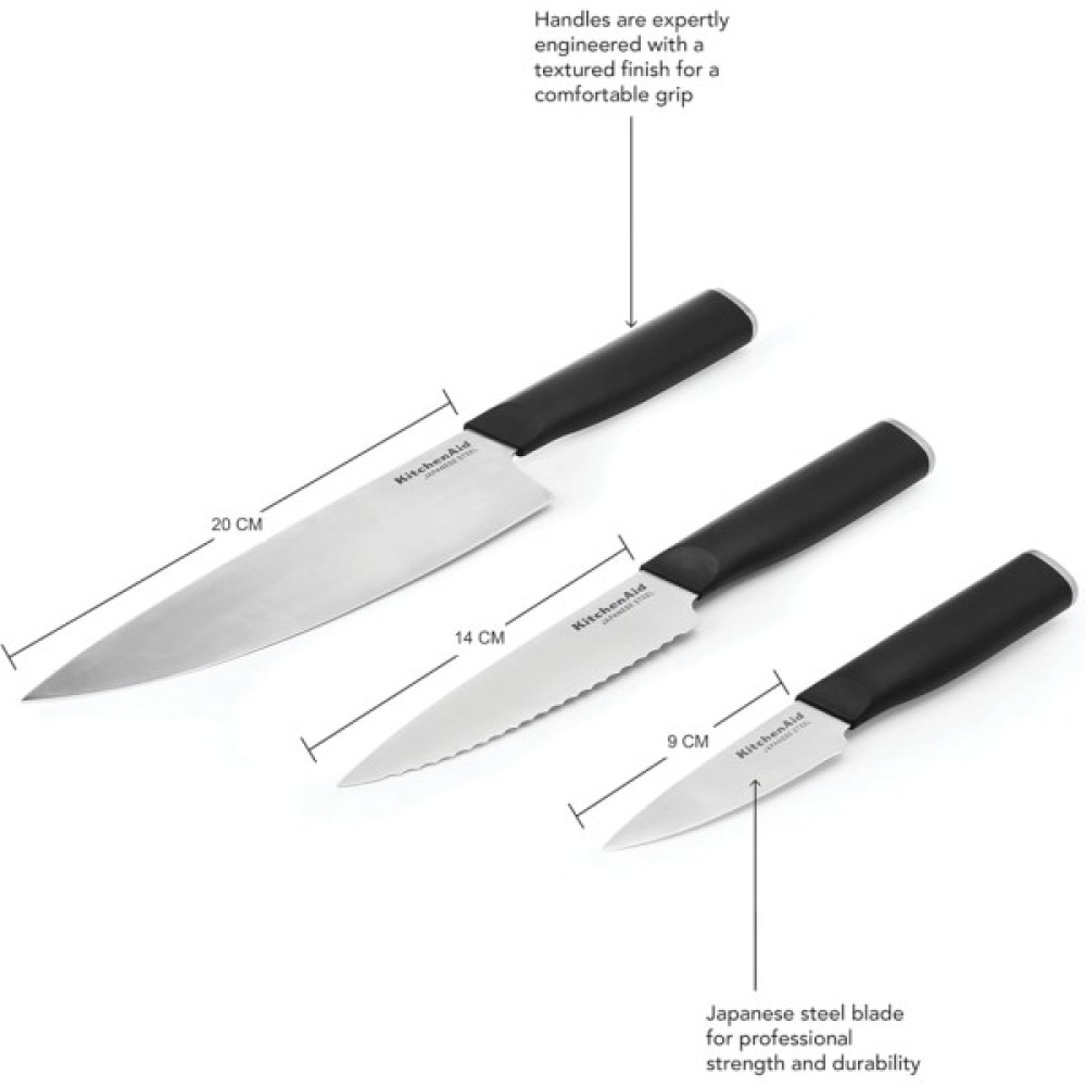Набір кухонних ножів KitchenAid Classic – це ідеальне рішення для повсякденного використання на кухні. Завдяки високовуглецевій японській сталі леза залишаються гострими довгий час, забезпечуючи професійну нарізку. Ергономічні ручки у східному стилі забезпечують зручність і контроль під час роботи. У комплекті передбачені спеціальні чохли для безпечного зберігання ножів. Для довговічності рекомендується мити вручну та витирати насухо.