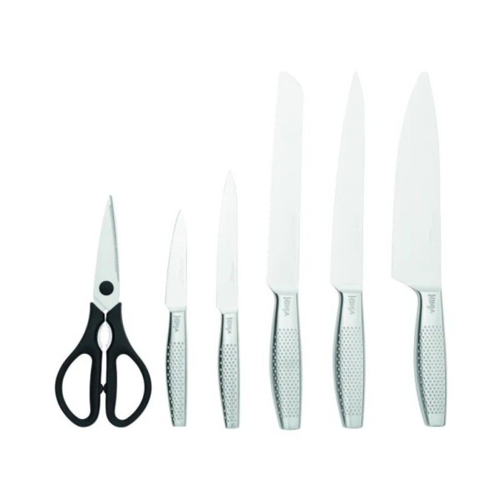 Набір Ninja StaySharp складається з шести незамінних кухонних приладів, кожен з яких призначений для конкретних завдань. Потужний шеф-ніж довжиною 20 см стане головним помічником у приготуванні більшості страв. З його допомогою ви легко наріжете м'ясо, овочі та фрукти, подрібните зелень та горіхи. Нарізний ніж такої ж довжини ідеально підходить для тонкого нарізання м'яса, риби та інших продуктів, де потрібна особлива точність. Універсальний ніж довжиною 13 см ідеально підійде для більш детальних робіт — чищення часнику, нарізки невеликих овочів чи фруктів або будь-яких інгредієнтів залежно від вашого комфорту. Спеціальний хлібний ніж з зубчастим лезом довжиною 20 см створений для акуратного нарізання свіжого хліба чи багету без зайвих крихт та деформації середини. Маленький 9-сантиметровий ніж для чищення овочів ідеальний для зняття шкірки. Завершують набір багатофункціональні кухонні ножиці, які допоможуть швидко нарізати зелень, відкрити пакування чи розділити птицю.