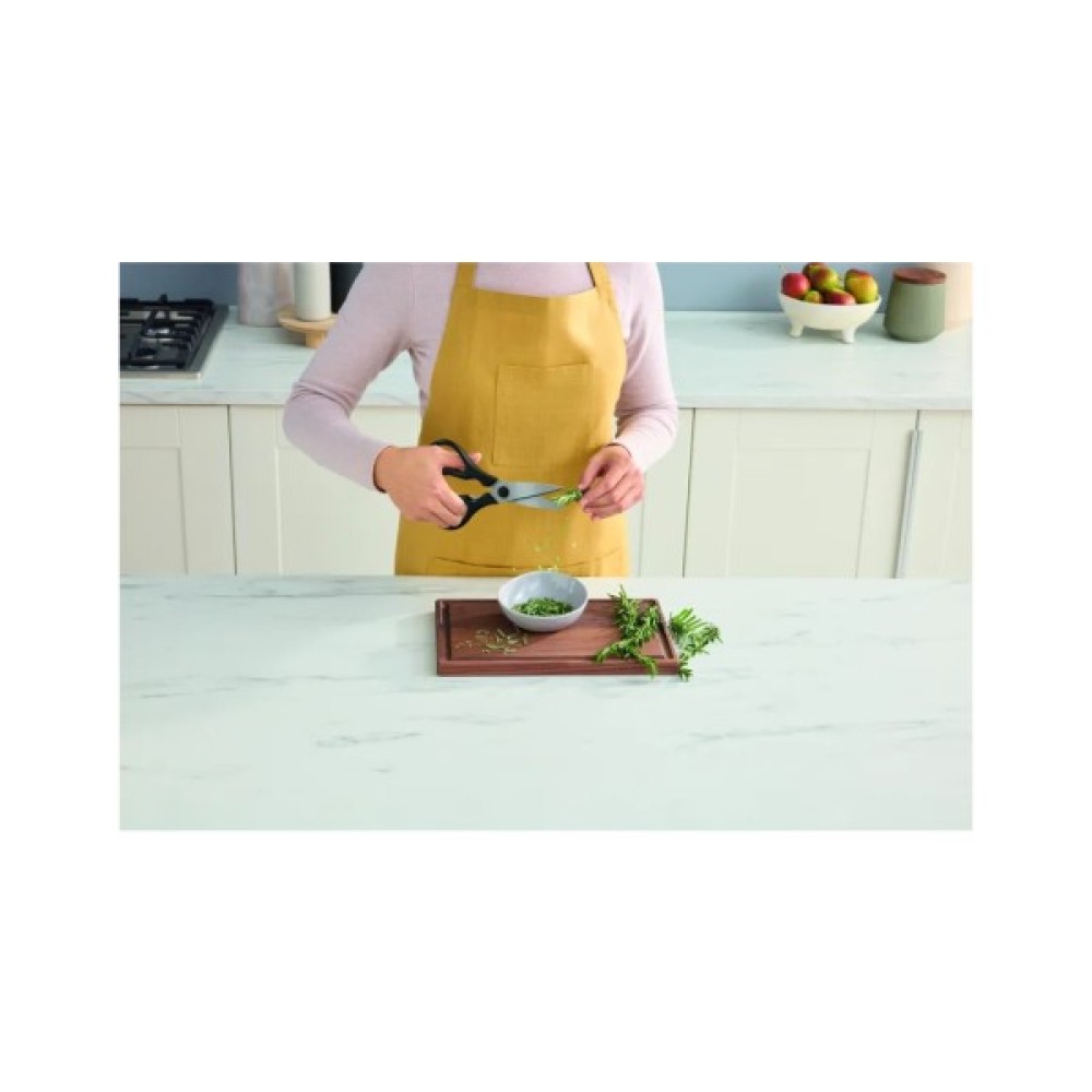 Помірно гострі ножиці є універсальним кулінарним інструментом, що значно полегшує виконання різних завдань з нарізання міцних продуктів. Вони легко справляються з розрізанням м'яса, риби, овочів та трав, а також допомагають швидко обробляти птицю або розділяти рибу на філе. Гострі леза забезпечують точність і легкість під час різання, щоб підготовка інгредієнтів була ще швидшою та ефективнішою. Потрібно відкрити пакування? Скористайтеся також ножицями з комплекту. І фінальний акцент — спеції та зелень для неперевершеного смаку й аромату.