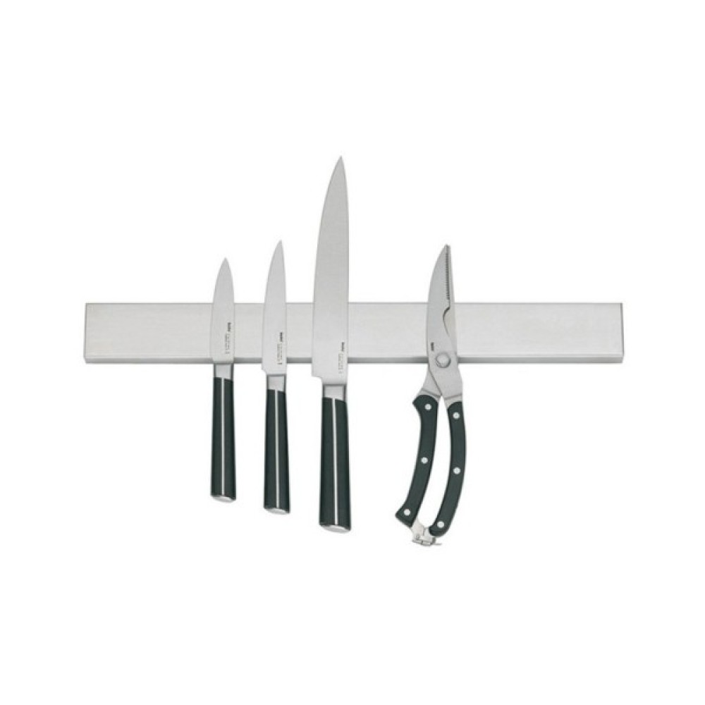 Магнітна планка для ножів KELA PlanНайважливіше кухонне приладдя завжди під рукою: просто прикріпіть магнітну планку KELA Plan до стіни, і ножі, кухонні лопатки або ножиці знайдуть своє місце. Виготовлена з матової нержавіючої сталі, з сильним магнітом. Розміри: довжина 36 см, ширина 5 см. Монтажна планка, з нержавіючої сталі, кріпиться до вертикальної поверхні за допомогою шурупів, які входять в комплект.