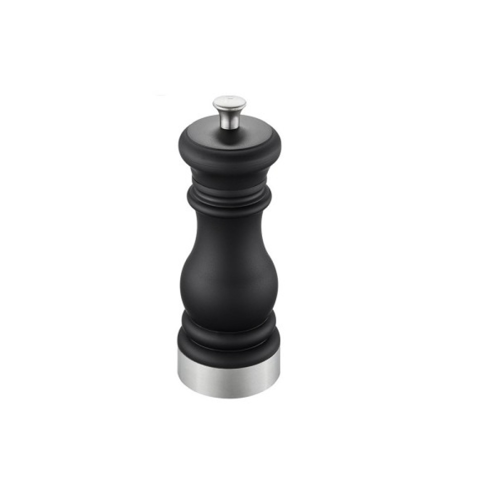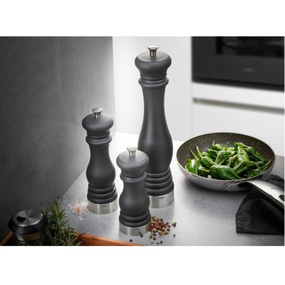Млинок для спецій Gefu Flavio з плавним регулюванням - це стильний дизайн, гарантія високої якості, компактний функціонал. Елегантний матовий чорний класичний дизайн виглядає особливо стильно і впишеться у будь-який кухонний дизайн. Легко і рівномірно перемелює кристали солі або перець горошком.