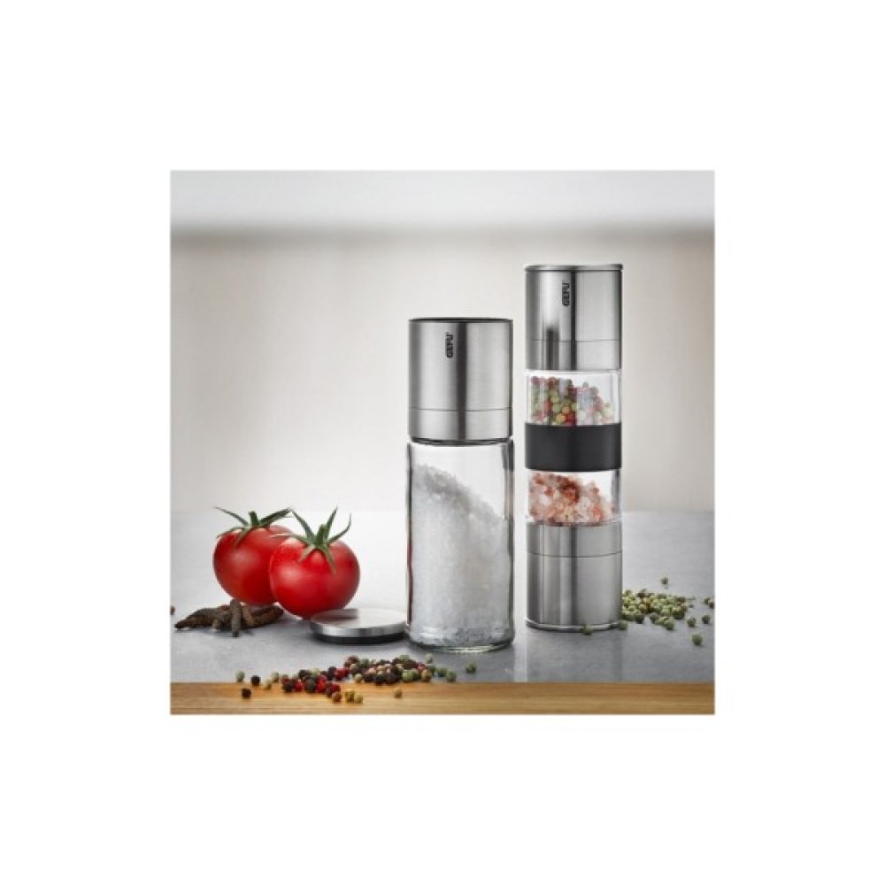 Якщо ви подрібнюєте сіль або перець, ви можете в одну мить приправити їжу за допомогою цього елегантного й компактного здвоєного млина. Обидві ароматизувальні ковпачки можна зняти й використовувати як маленькі розмельні ємності для зручного відмірювання потрібної кількості. Отже, немає потреби тримати млин над парою, і ніщо не прилипає до повністю регульованої кавомолки.