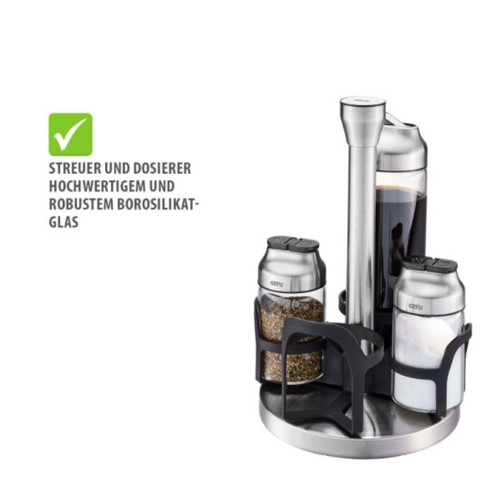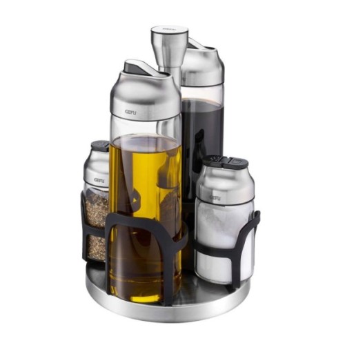 Набір для спецій Gefu Kippo — ідеальне рішення для організації приправ і сервірування страв зі смаком та стилем. У комплект входять пляшки для олії та оцту, а також шейкери для спецій і трав, розміщені на зручній обертовій каруселі. Завдяки сучасному дизайну й продуманій конструкції, цей набір для олії, оцту та спецій стане не лише практичним помічником, а й стильним елементом інтер’єру кухні або столу.