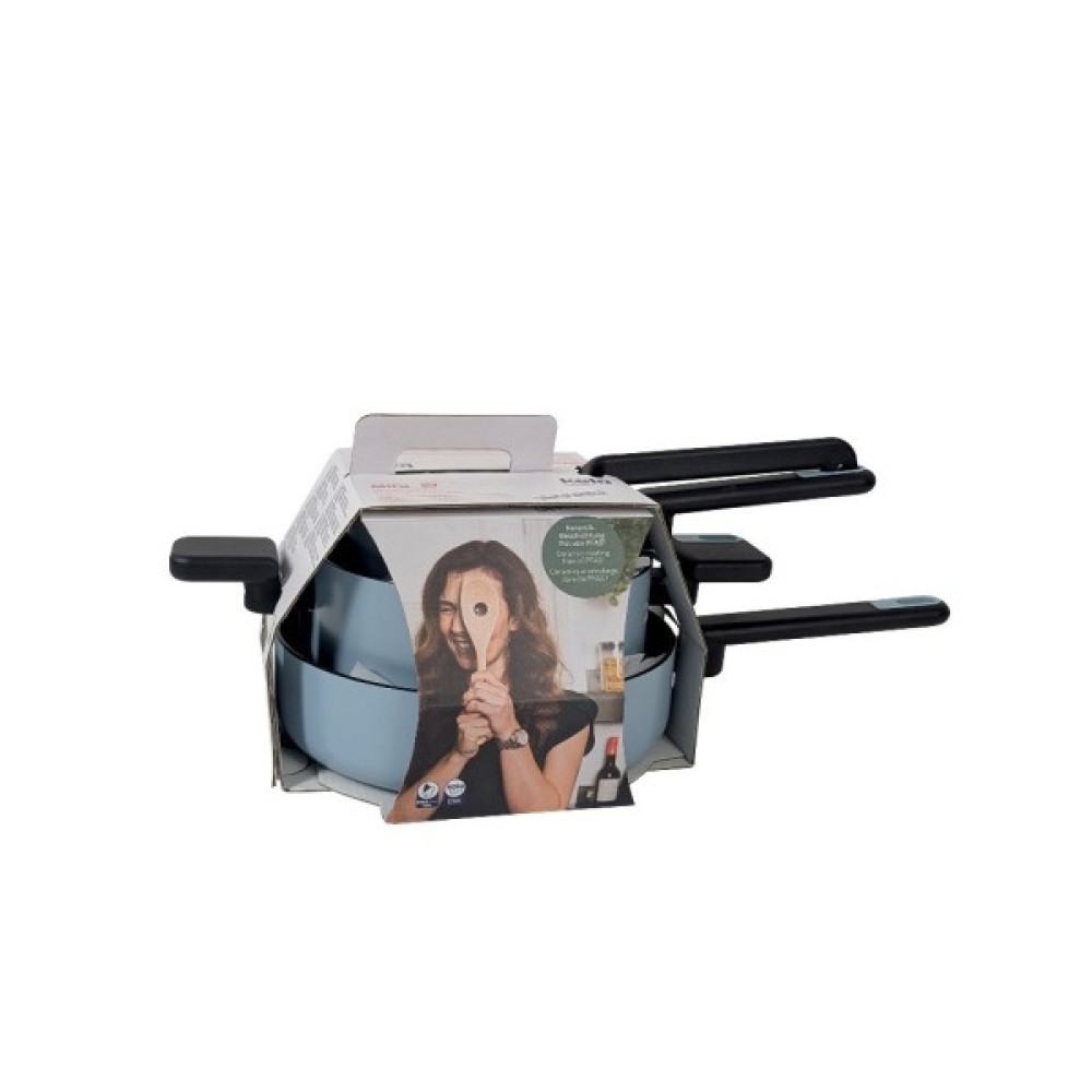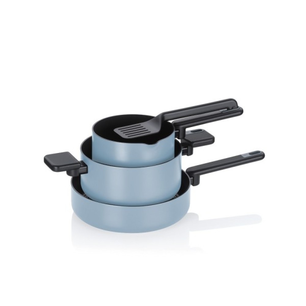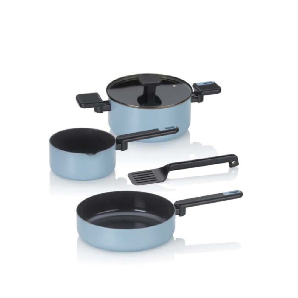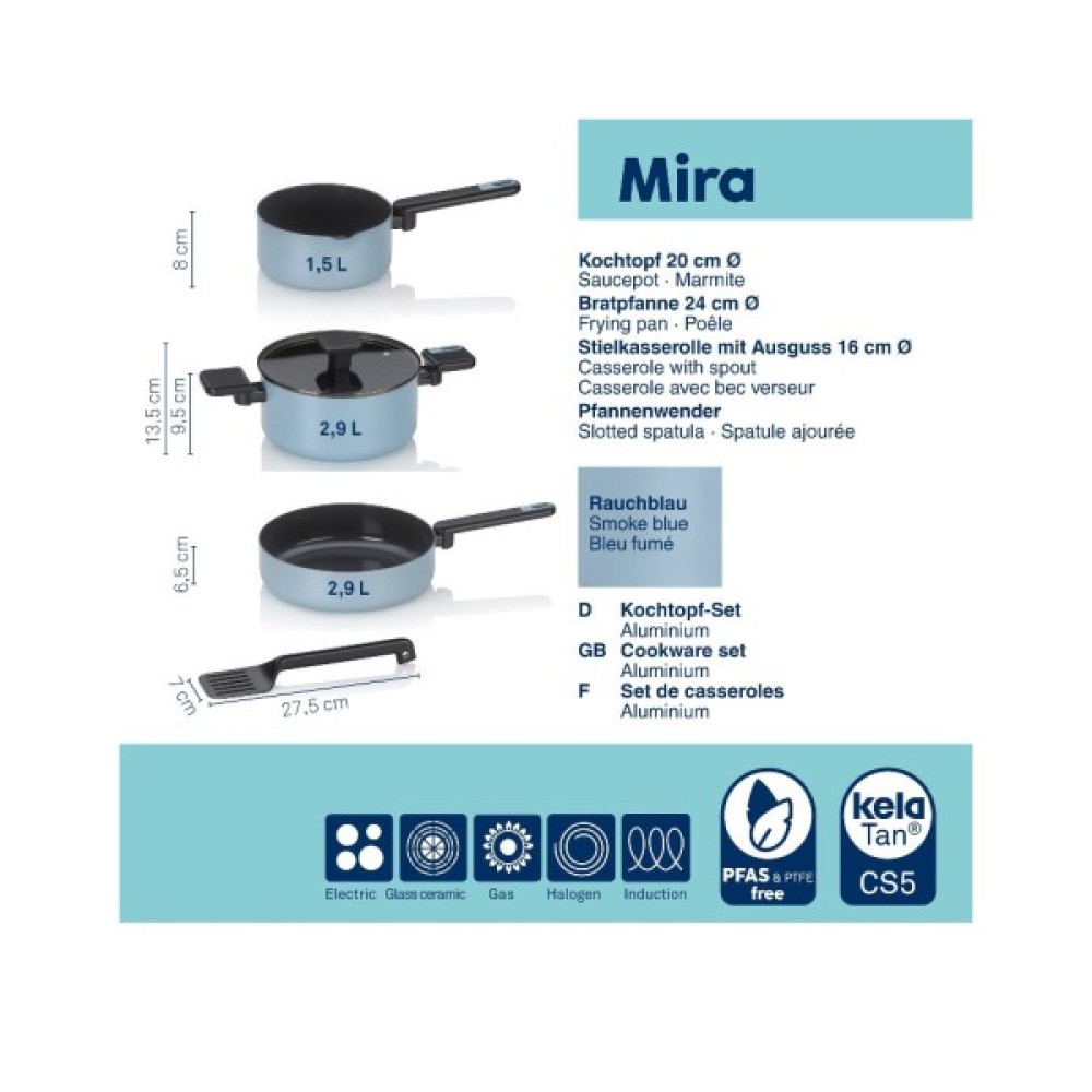 Набір посуду KELA Mira з алюмінію з керамічним покриттям виглядає стильно та елегантно. Цей набір посуду поєднує сучасний дизайн з високою функціональністю — він ідеально підходить для тих, хто цінує естетику та якість на кухні. Елегантна матова поверхня димчасто-синього кольору надасть вашій кухні стильного акценту.