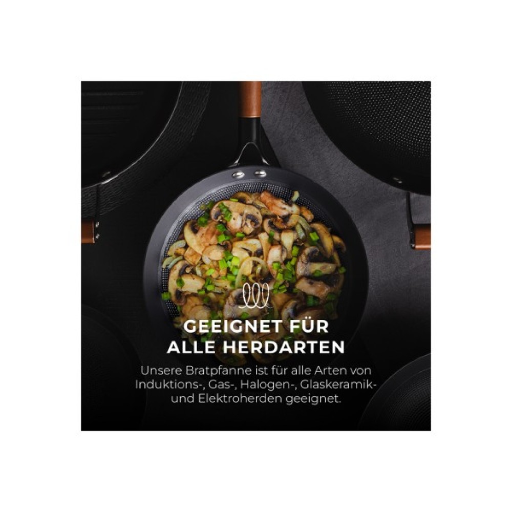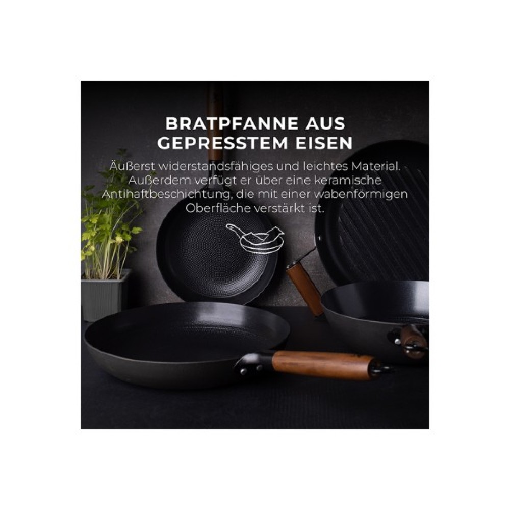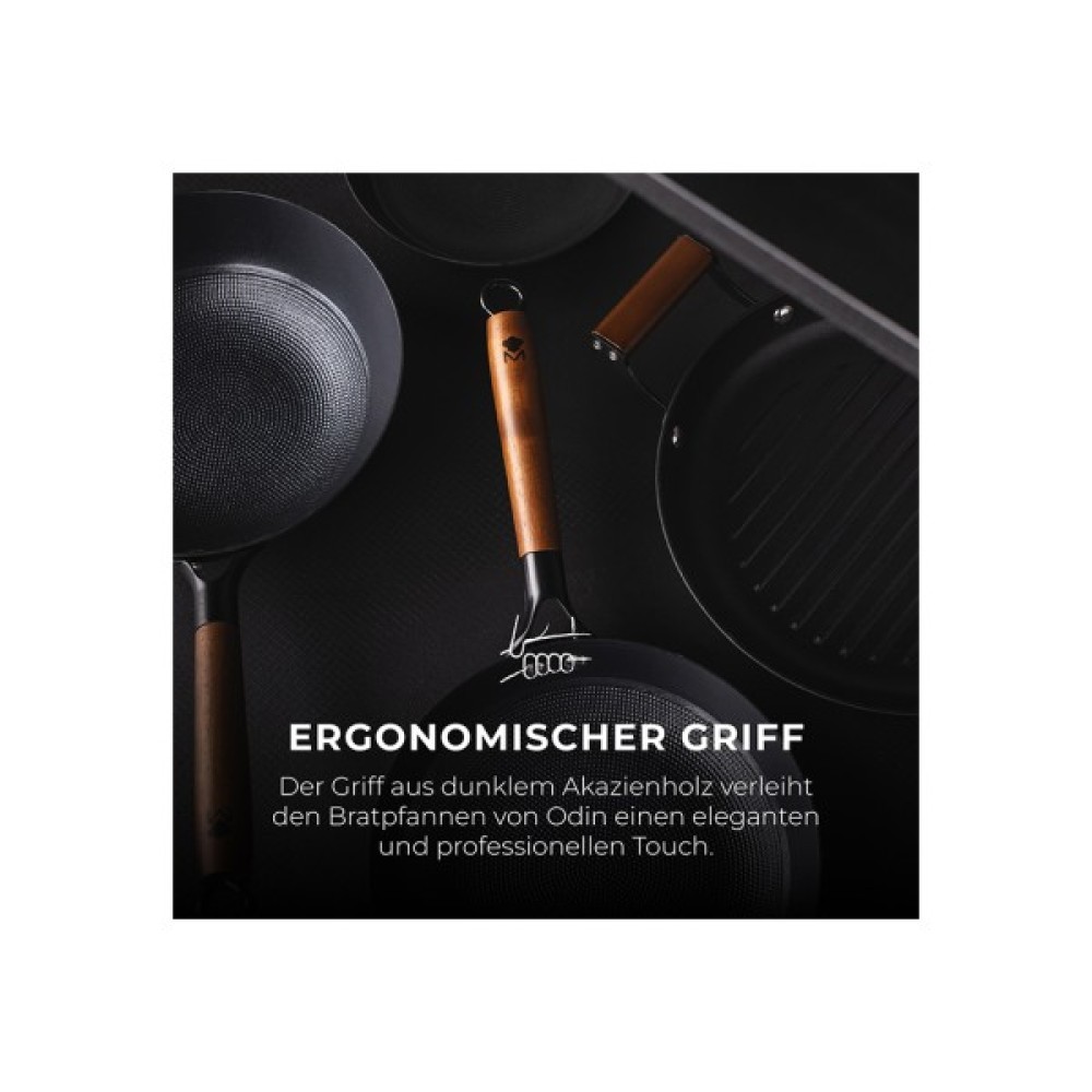 Особливою рисою серії ODIN є стильні дерев’яні ручки, які не лише додають сковородам вишуканого вигляду, але й забезпечують комфортне користування, захищаючи від перегріву. Кожна сковорода має покриття CERA+, яке гарантує виняткову антипригарність та легкість у догляді. Ці сковороди сумісні з усіма типами плит, включаючи індукційні, що робить їх універсальними інструментами на будь-якій кухні.