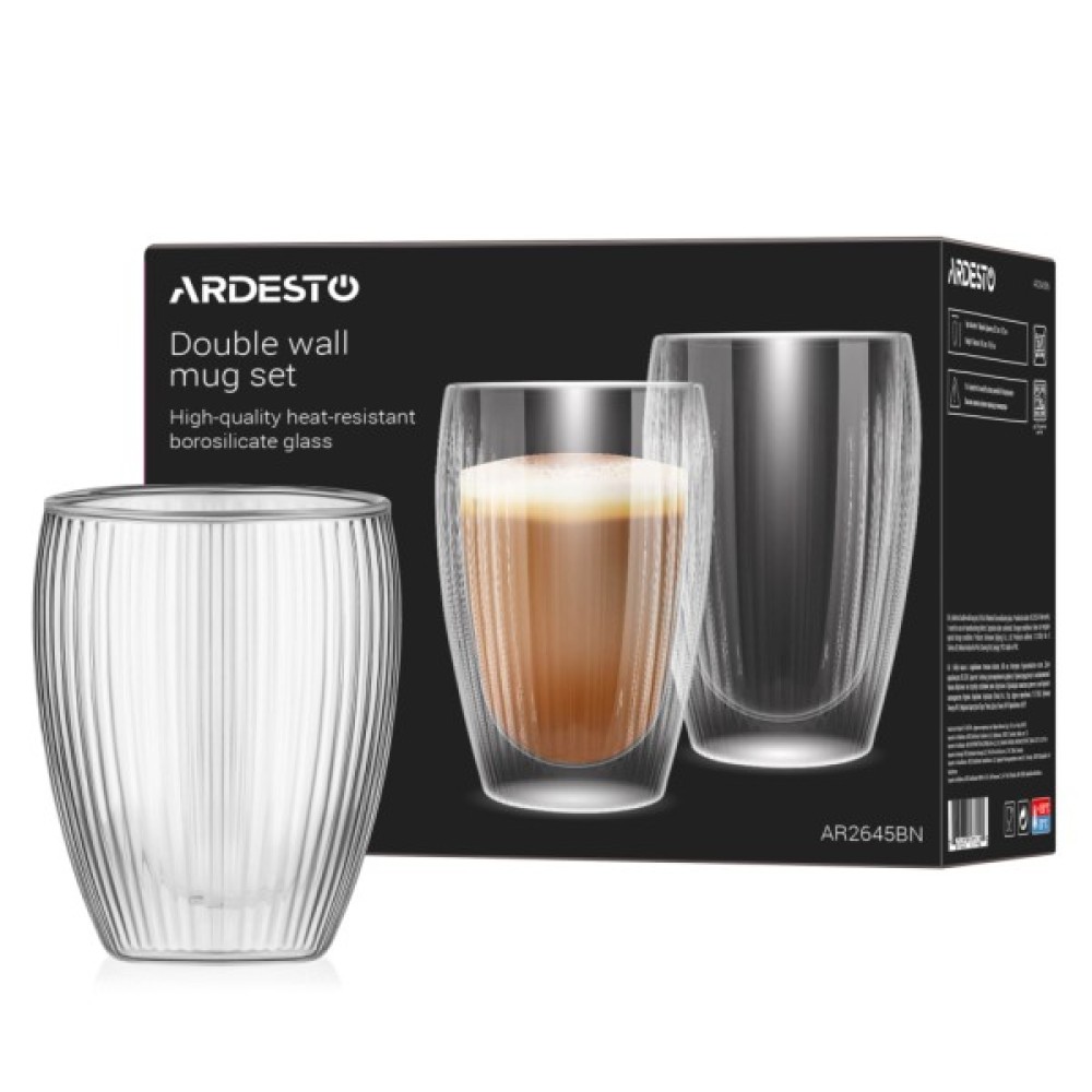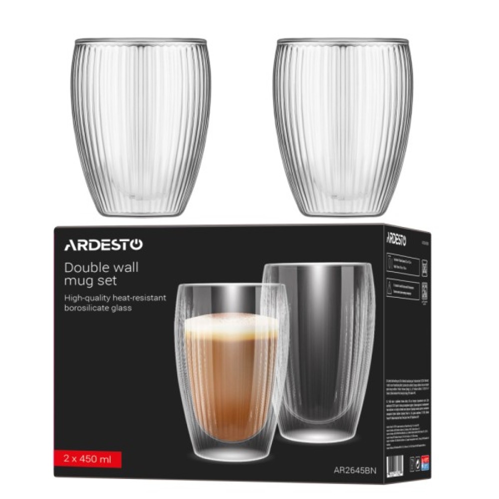 Відкрийте для себе чарівність простоти та елегантності з набором чашок із подвійними стінками ARDESTO, які виготовлено з якісного боросилікатного скла, що зумовлює їхню термостійкість від -20 до +150 °C. У наборі – дві чашки, об’єм кожної становить 450 мл за висоти 14,6 см і верхнього діаметра 8,2 см. Вироби придатні до миття в посудомийній машині (до 50 циклів) і використання в мікрохвильовій печі за температури до 100 °С.