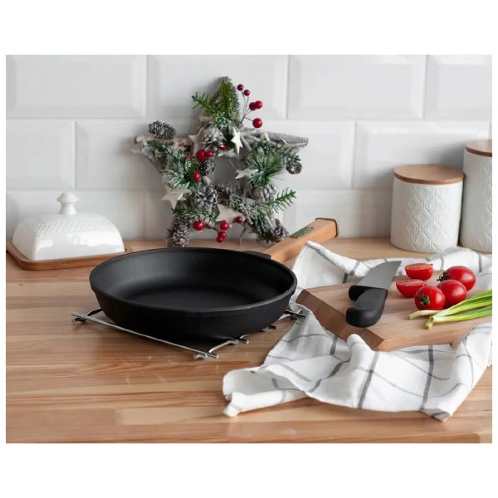 Переваги чавуну можна перелічувати нескінченно, а от що дійсно заслуговує окремої уваги, – це смак страв, приготованих в такому посуді, він унікальний! Завдяки рівномірному прогріванню всієї поверхні сковороди створюється ефект готування в печі.